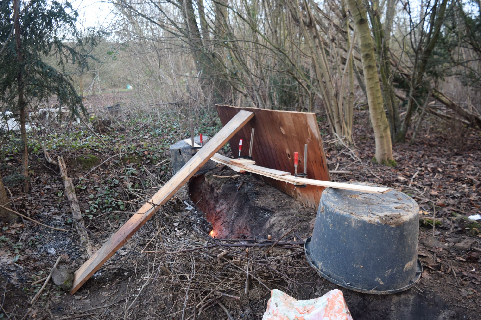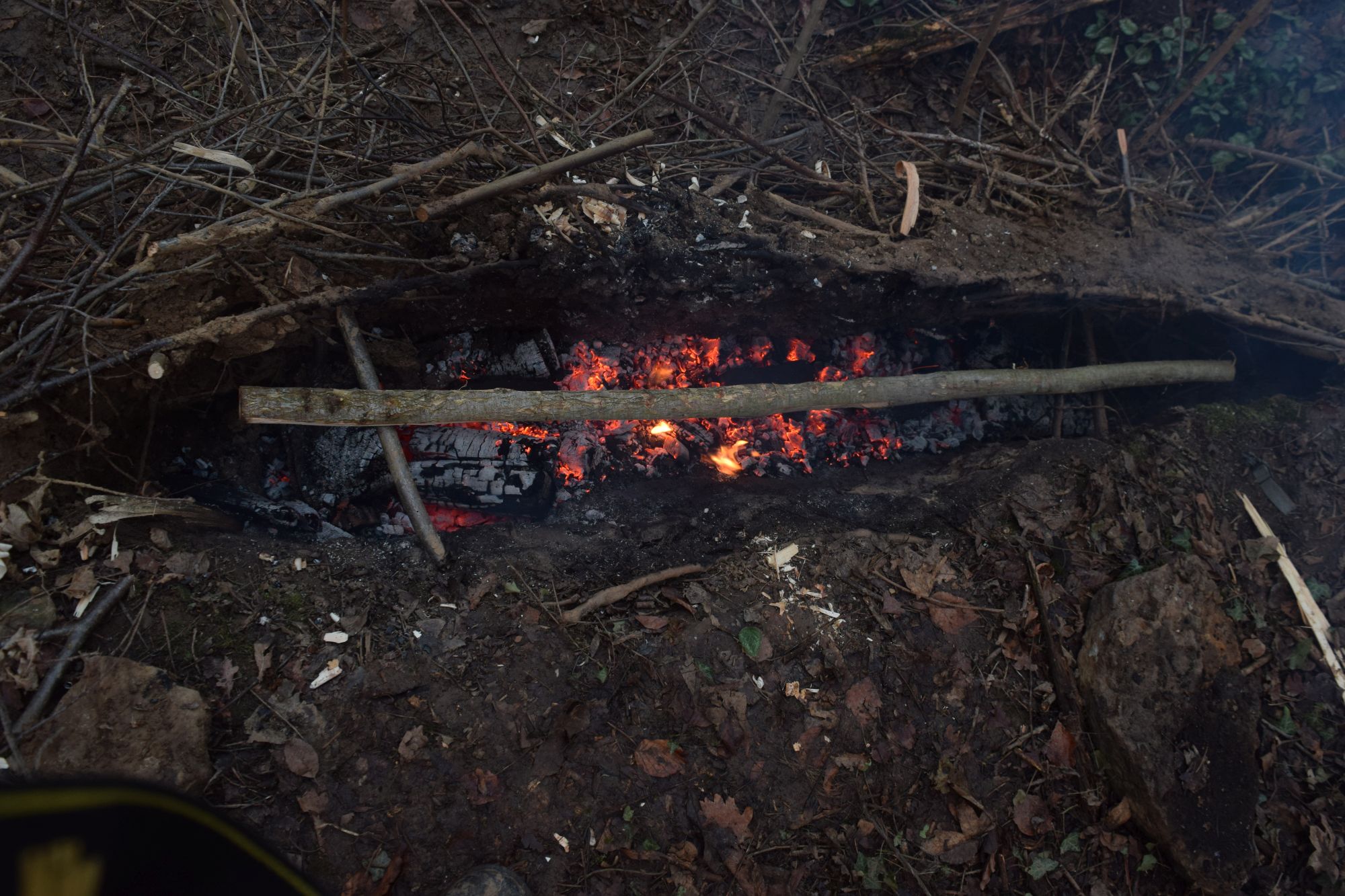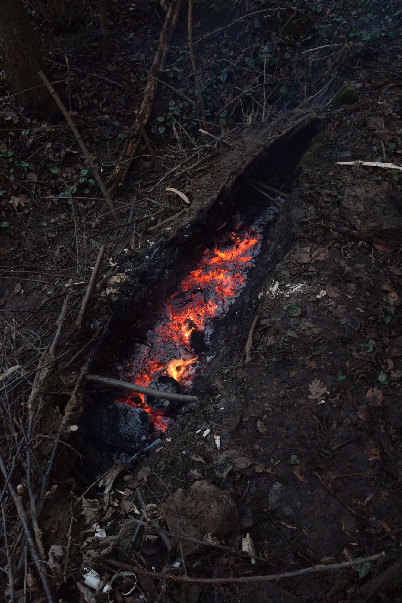 Zum Trocknen habe ich in einer Grube aus Lehm und Stöckern eine kleine Trockenkammer zusammengematscht, ein großes Feuer gemacht, das Ding mit Glut gefüllt und samt Bogen dann noch mit einer Palette und ein paar Decken von oben abgedichtet. Da ist er, stand jetzt, seit 3,5 Stunden drinne. Ich habe offen gesagt gar keine Ahnung, ob die Temperatur passt (habe gerade nochmal gefühlt, ordentlich Hitze ist auf jeden Fall noch vorhanden) ,wie lange er drinne sein muss oder ich den Rohling anders hätte präparieren müssen. Gut möglich, dass ich in Kürze von Fehlschlag des Experiments berichten werde und mir morgen nen Hasel suche ;D