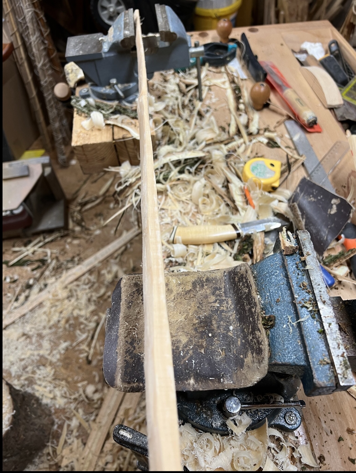 Und mit dem kleinen Holler gehts weiter: Schälen, Halbieren mit der Bandsäge, und Aushöhlen, Hollow limb design, habe ich noch nie gemacht, 170cm, 3cm breit im Griffbereich, auf 1,5cm an den Bogenenden getapert, die Dicke habe ich nur gering verjüngt, der Griff biegt mit, die Griffgestaltung wird aber mit dem Dachrinnendesign interessant. Beim Hasel wars eine Stunde Arbeit, bei der Dachrinne aber 2,5 Stunden, beim Paddelbogen waren es auch 2,5 Stunden Schnitzen und Biegen, nasses Holz läßt sich bearbeiten wie Eibensplint (cremig) und beim Sägen staubt nix!