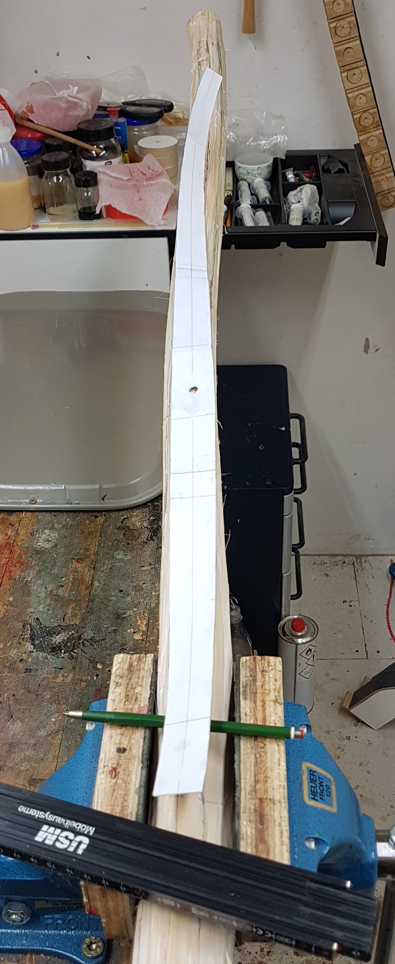 Heute habe ich bei der reflexen Hälfte einen möglichen WA-Verlauf gecheckt. Also zuerst mal die höchsten Stellen auf dem Rücken markiert, dann das Teil auf die Seite gelegt und geschaut was geht. Danach grob ein Bogenlayout aufgezeichnet und fertig für heute.