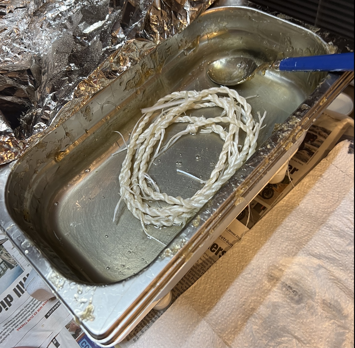 Und dann habe ich mich noch an der Herstellung einer echten Bogensehne versucht. Erstlingswerk, sieht man am wechselnden Kaliber. Und jetzt heißt es wieder warten oder besser ausrasten. In einer Woche habe ich doch einiges geschafft und ich brauche Erholung