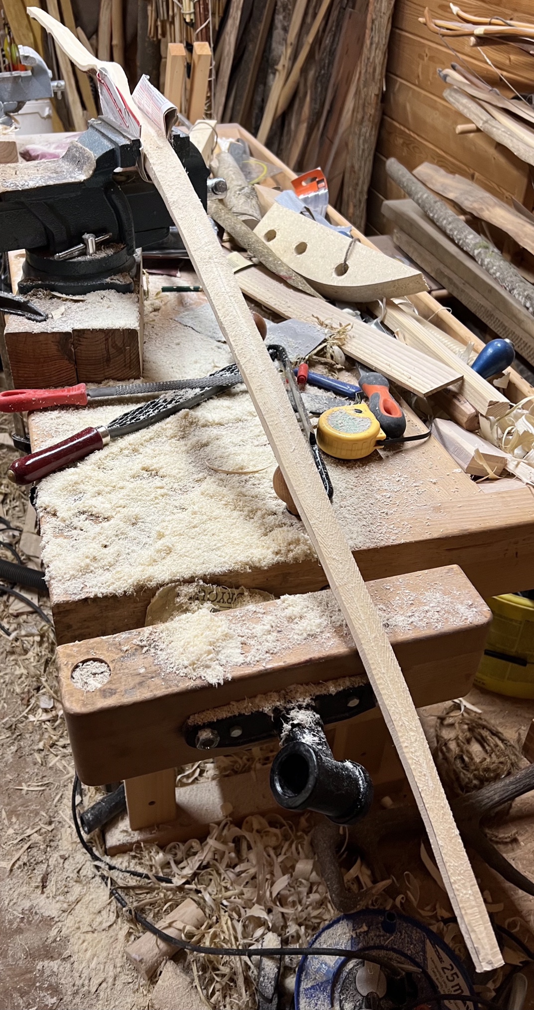 Jetzt habe ich es doch nicht fertig gebracht den geernteten Flieder (160cm, 4cm Durchmesser) in der Ecke sehen zu lassen. So wie von den alten Füchsen empfohlen habe ich den Bogen gleich in die fast fertige Form gebracht. Mit der Bandsäge grob ausgesägt und dann zurecht geraspelt, Bodentiller schaut gut aus, extrem elastisches Holz! im Griffbereich dann noch den Markkanal freigelegt und dann die Rinde abgezogen und zuletzt die Enden mit Leim versiegelt. Jetzt steht er in der Waschküche (von Minus 10 Grad auf plus 22 Grad, ob das gut geht?) Gewicht jetzt 641 Gramm, Arbeitszeit 2,5 Stunden