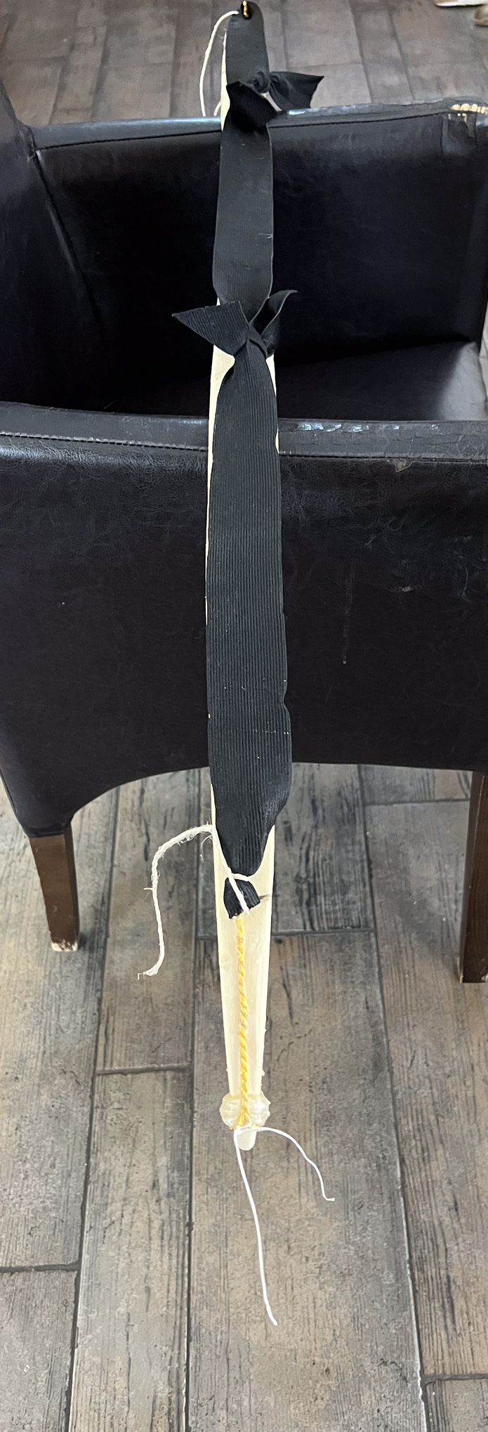 Weiter gehts mit dem Holler Paddelbogen: der Bogen hat jetzt 2 Tage konstantes Gewicht (310 Gramm), die Bogenenden hat es leicht verzogen. Zurecht schleifen bis die Flucht passt. Bds. 1cm kürzen, dann Anbringen von Wickelnocken (Straußensehnenfasern und Hasenhautleim), mit Sehnenschlaufen wird gleich eine Rinne eingepresst. Dann Wickeln mit Folie (Schutz vor Übertrocknung) und über den Bodenauslass der Wohnraumlüftung platziert. Und wieder warten…..