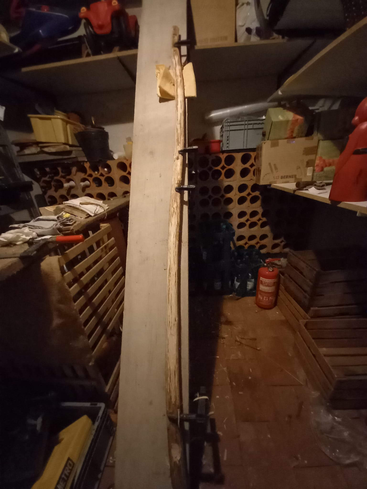 Verkehrt herum auf einer Diele festgespannt und hier werde ich jetzt peut á peut an den WA rinde abnehmen und ihn ein paar 100g verlieren lassen. So finde ich vermeidet man am besten die Risse und spart sich den Entlastungsschnitt.