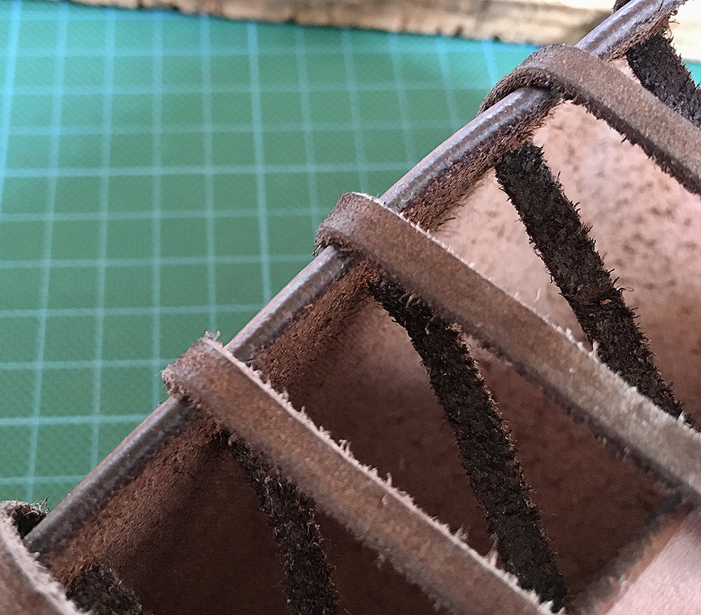 Das Leder ist noch flexibel und ich habe die Kanten gehobelt und mit Bienenwachs poliert. Dabei ist mir aufgefallen, dass sich der feste Teile des Leders gut bearbeiten ließ, aber in einem bestimmten Bereich wurde es irgenwie stark faserig und eher weich an der Kante. Dort hat das mit dem Polieren irgendwie nicht geklappt, stattdessen ist die Kante eher ausgefranst.