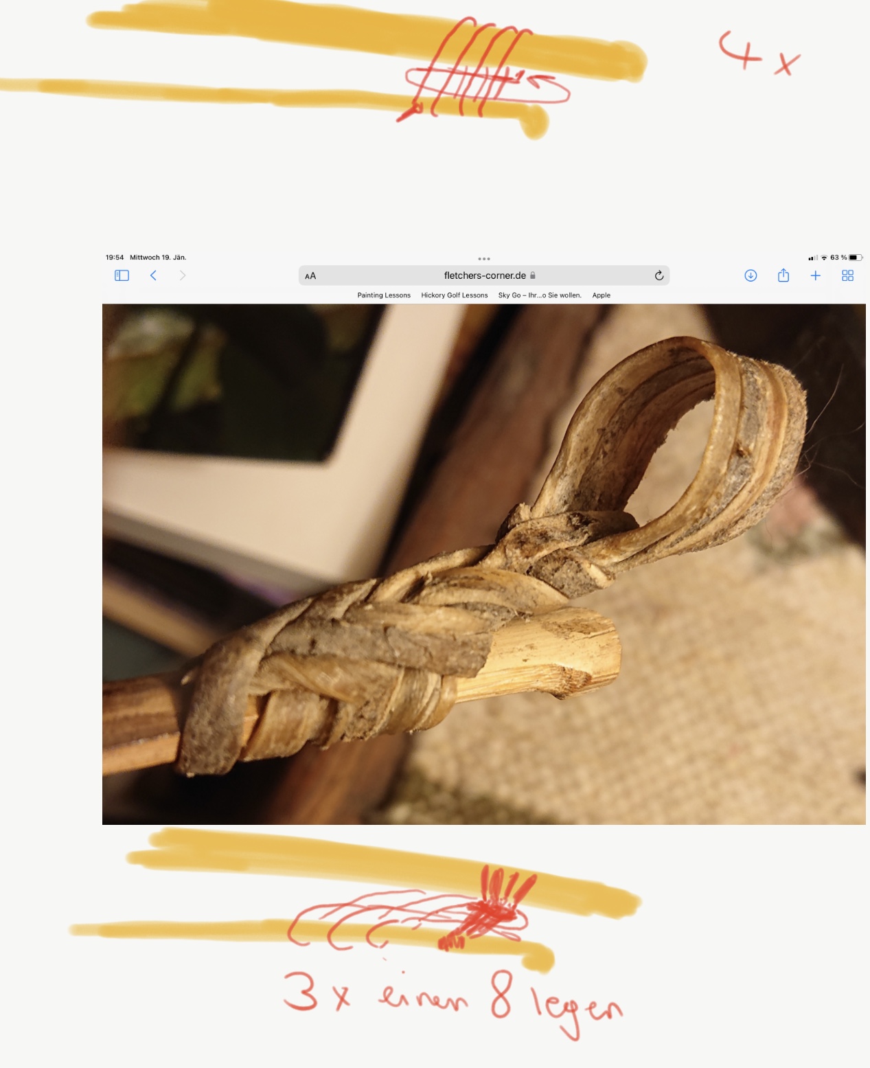 Bei der Rohhaut bin ich ziemlich sicher, dass es nur ein Streifen ist mit dem Anfang beim roten Pfeil und dem Ende beim grünen... Um den Bogen sind es 4 Schlaufen und um den Bambus 6... Vllt hast Du dazu eine Idee...