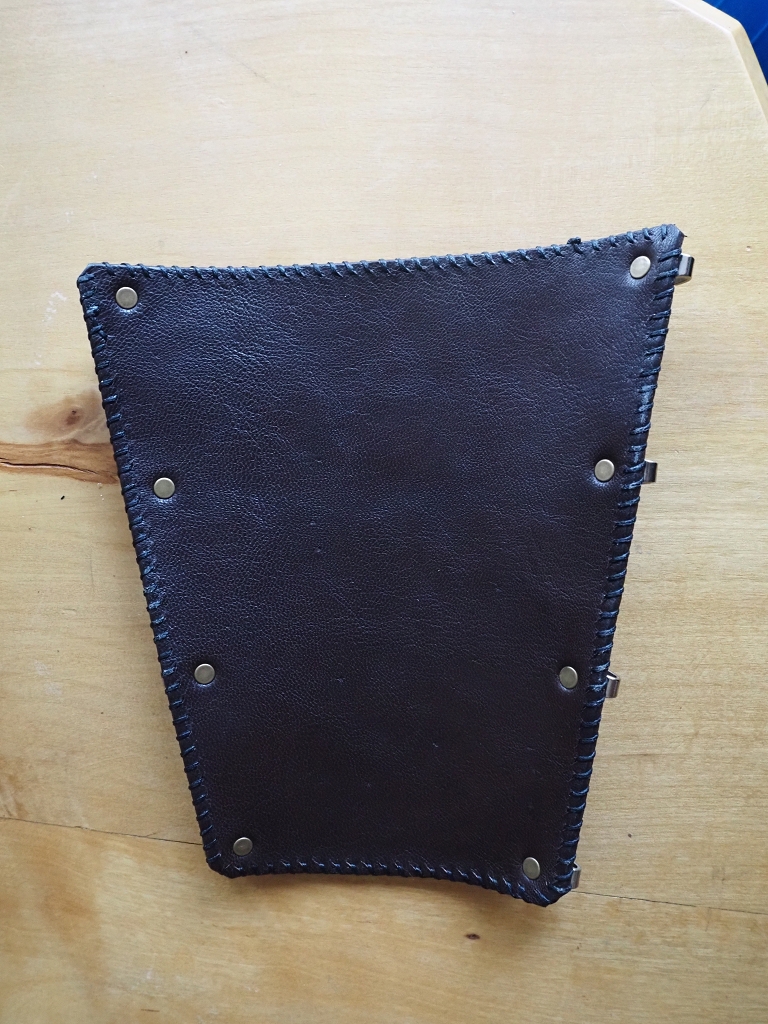 Die Schnürung ist weiches Lederband. Damit es noch weniger stört habe ich keine Löcher gestanzt, sondern Rechtecke mit der Klinge geschnitten, sodass die Bänder ohne Verdrehung geführt werden. Knöpfe und Schnallen sehen bei mir meist überdimensioniert und klobig aus, weswegen ich die Schnürung passender finde, auch wenn es mehr Arbeit beim Schnüren bedeutet. Das Ende wickel ich einfach mit ein paar Schlaufen. Sieht unprofessionell aus, aber hält bisher. Vielleicht kann ich mir da noch was überlegen.