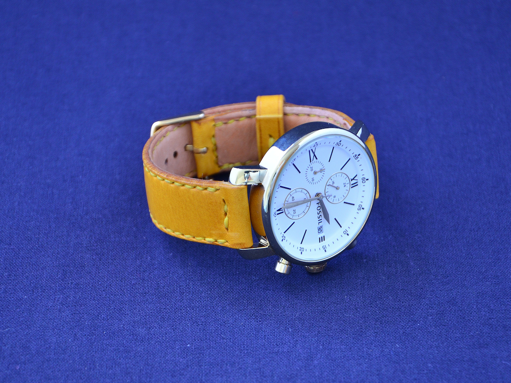 Das Leder ist Italienisches Butter in Senfgelb, etwas aufgepolstert und das Innenfutter aus naturbelassenem vegetativ gegerbtes Rindleder. Die Schnalle ist neu gekauft, die vorhandene Schnalle hat einen rechteckigen Dorn. Ich habe da kein Locheisen für.