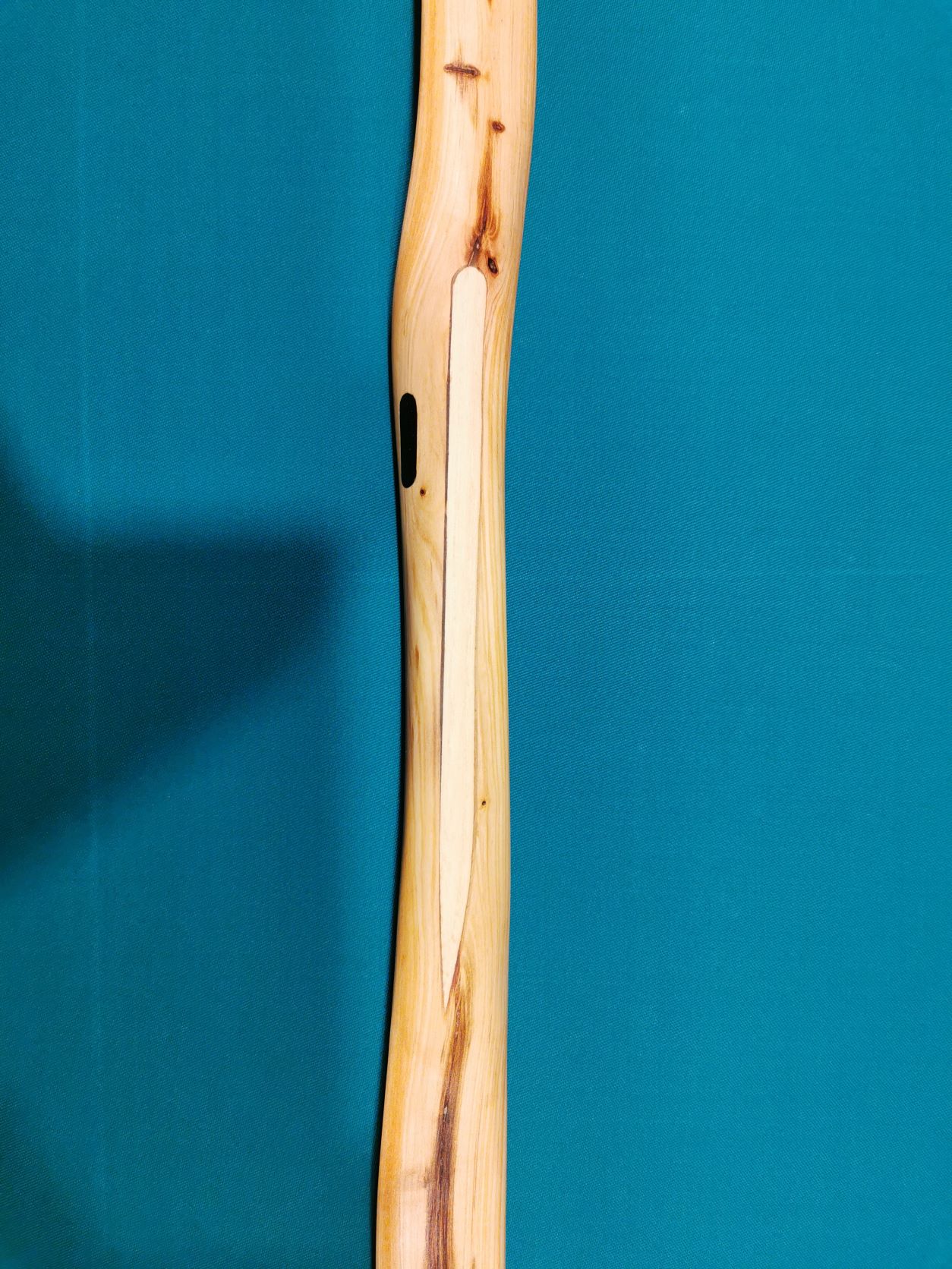 Da habe ich sehr rustikal mit dem ersten Stück Holz das mir in die Finger kam den Entlastungsschnitt ausgeleimt, im Glauben es sei Weißdorn vom anderen Bogen. Später habe später habe ich festgestellt, dass es Traubenkirsche ist.