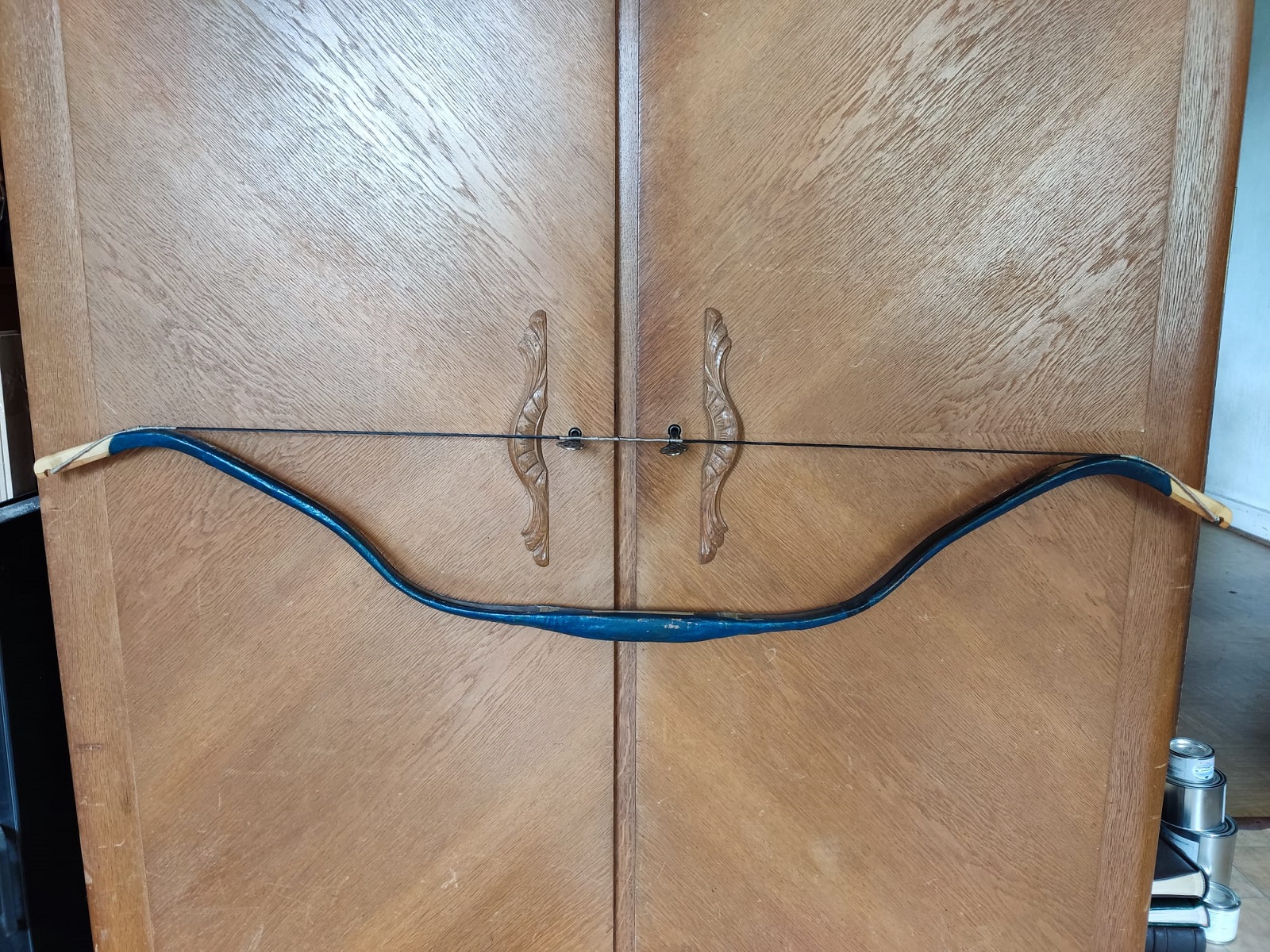 Naja... einen Wermutstropfen gibt es für mich doch noch. Nach dem der Bogen fertig war, habe ich das Leder mit 5 Schichten Schellack überzogen und danach versucht dem Bogen etwas Farbe zu geben. Nach einigen Farbproben auf einem kleinen Stück Leder hatte ich gedacht ich hätte eine gute Farbe gefunden eine Künstlerölfarbe von "Lukas Studio" falls das einem was sagt. Es wirkte auf dem Probestück abriebfest und gefiel mir sehr gut. Also mit Abstand einiger Wochen zwei Schichten davon aufgetragen, dazwischen noch zwei Schichten Schellack. Die ersten Schüsse haben aber gezeigt, dass die Farbe nicht so fest ist, wie ich gehofft hatte. Runter bekomme ich die Farbe jetzt leider nicht mehr und ich bin nicht sicher, ob sich ein weiterer Anstrich lohnt.