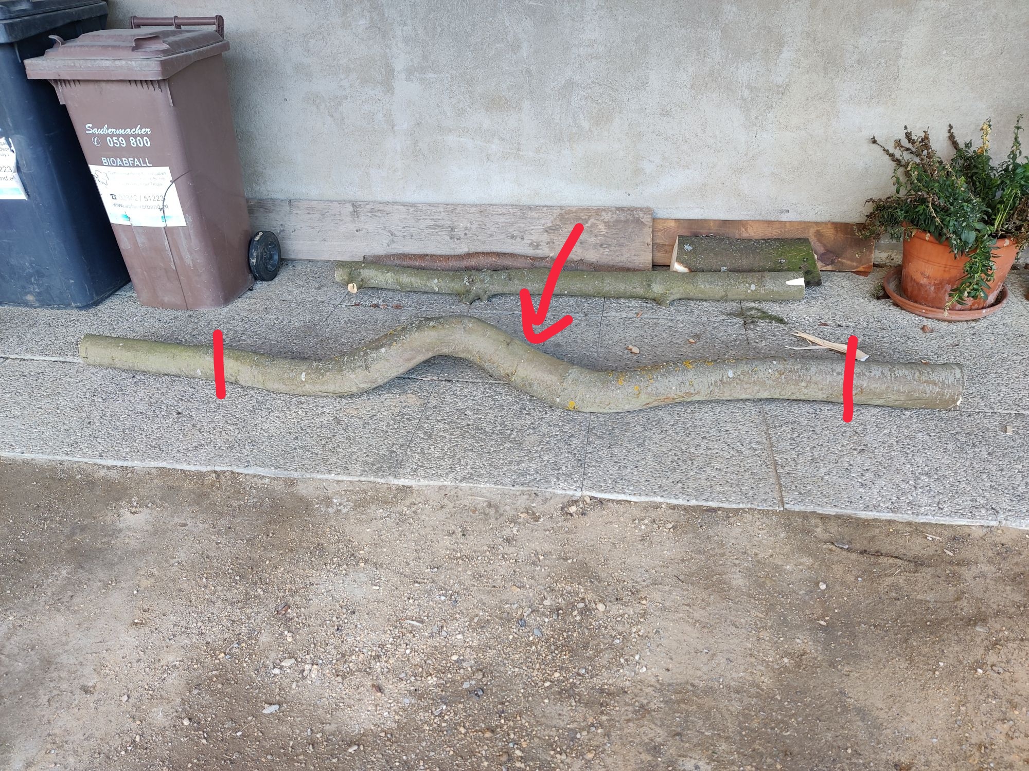 Ich hab ihn erstmal auf 2,6m abgeschnitten, so dass der geplante Griff ca auf halber Länge des Rohlings liegt. Ich will auf Nummer sicher gehen dass der nicht beim Trocknen schon stirbt. So kommen an beiden Enden noch jeweils etwa 40cm weg. Da hab ich Luft was das einreißen angeht. Momentan wäre der Plan, einen 1,7 - 1,8m langen Flachbogen oder HLD draus zu machen.