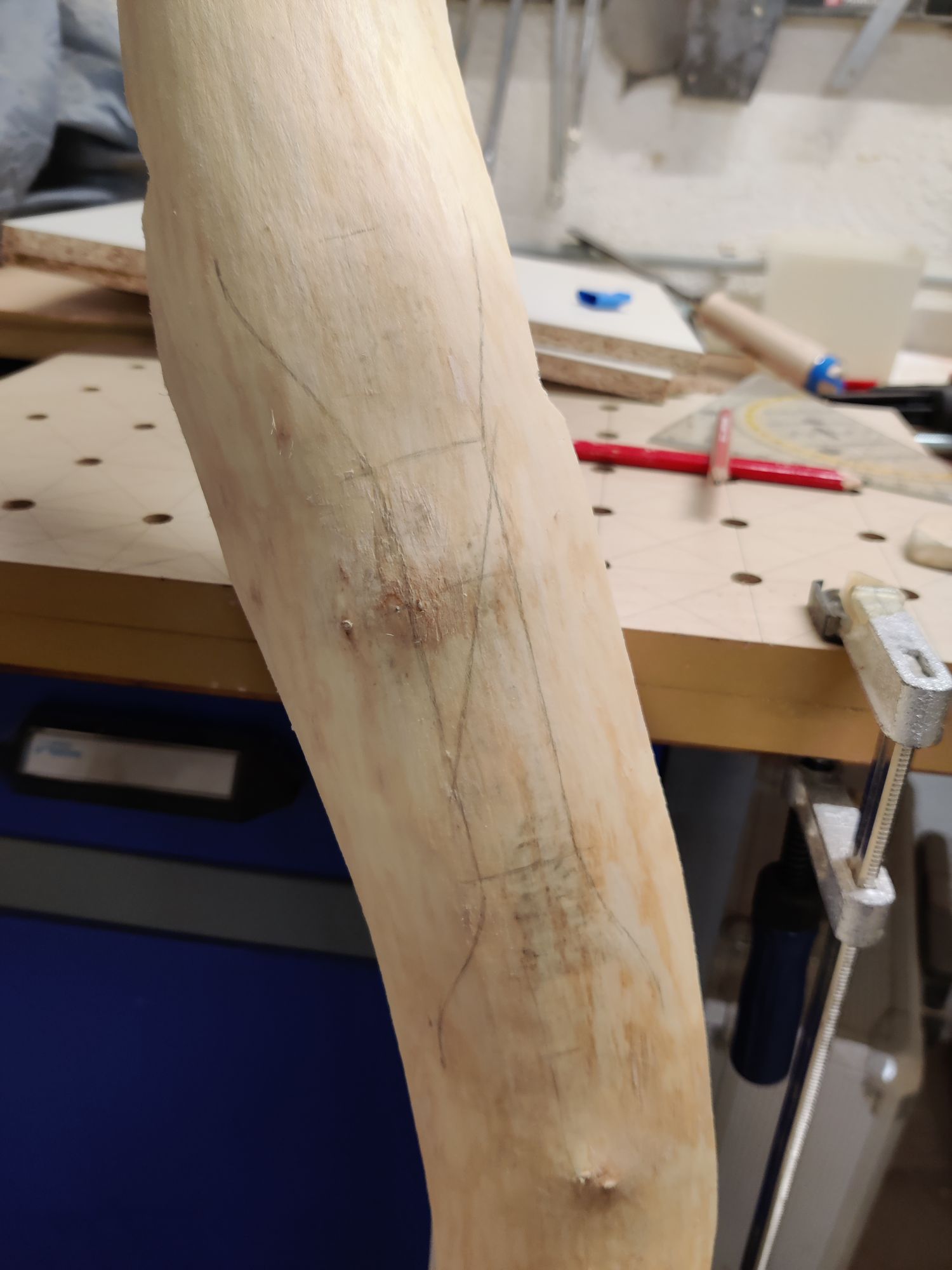 Momentan plane ich den Bogen wie auf meiner Skizze zu sehen zu platzieren. Da sollten die Biegungen und Proportionen halbwegs stimmen. Der Bogen hätte dann einen sehr schrägen Griffbereich mit "Centercut". Mal schaun wie die Sehnenlage nach dem trocknen ist. Wenns nicht passt bieg ich ihn im steifen Griffbereich zurecht. Von der Seite betrachtet wirds dann nicht weniger heftig als von Vorne. Hat irgendwie was von nem Deflex-Reflex Langbogen