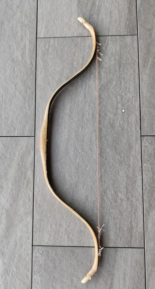 Oben in Griff Nähe biegt er gleichmäßig, was ich so erkennen kann. Mir ist so, als ob das linke Kasanauge noch zu viel Biegung hat(zu wenig geöffnet). Mein Tipp,bevor du irgend was machst, zeichne den auf gespannten Bogen auf einen Karton, dreh den Bogen um und schon siehst du genau, wo er anders biegt. Wenn es das Kasan Auge ist, so habe Gefühl an dieser Stelle,dann kannst du ihn durch leichtes erwärmen im aufgespannten Zustand etwas kommen lassen, aber Vorsicht nicht zu stark erwärmen, sodass das Horn zu weich wird, sonst kommt er zu stark und der Kleber zwischen Horn und Kern könnte Schaden nehmen. Du kannst ihn auch abgespannt an dieser Stelle erwärmen und von Hand vorsichtig über das Knie einbiegen. Nachteil du kannst Verdrehungen nicht so gut erkennen.