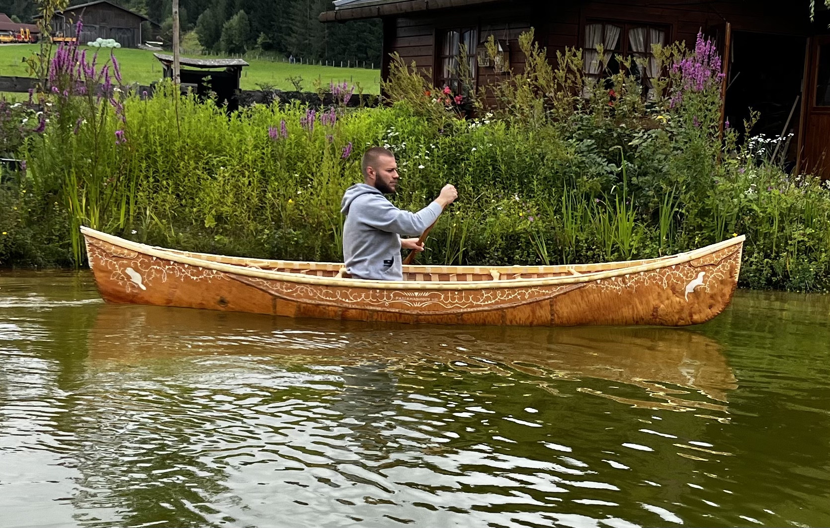 Nach dem Aufbringen des Baumharzes habe ich eine Dichtigkeitsprobe und eine Probefahrt gemacht. Das Boot fährt sich perfekt und ist sehr kippstabil, jetzt habe ich nach dem Trocknen ein Leinöl Firnis aufgebracht und jetzt heißt es wieder warten, Leinöl Firnis mag zwar 2x gekochtes Leinöl sein, aber es werden trotzdem von den Firmen zusätzlich Sikkative dazu gemischt, auch nicht sehr original. Als Künstler weiß ich selbst, dass die Firnisage von Ölbildern erst nach 6 Monaten erfolgt, die Geduld habe ich in diesem Fall nicht. Als Alternative gäbe es noch schnelltrocknende Alkyd Ölfarbe, aber da habe ich gleich Acrylfarbe genommen, der Binder in Acrylfarbe ist ein Kunstharz und damit nichts anderes als Weißleim, Weißleim habe ich auch zur zusätzlichen Sicherung der Holznägel verwendet.