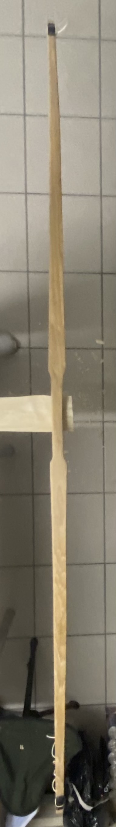 19 Zoll Auszug - 30.2 Pfund 20 Zoll Auszug - 34.4 Pfund Verschiebbarer Knoten am reparierten Wurfarm (Riss) Sehnenverlauf im Griffbereich Anderer Wurfarm (längerer) Gesamtsicht Sehnenverlauf Bogen in Hand - Sehnenverlauf (Wurfarm mit Riss = unten (kürzerer WA)) Skizze mit den Abmessungen - Breite und Dicke sowie genaue Detailmasse beim rep. Riss