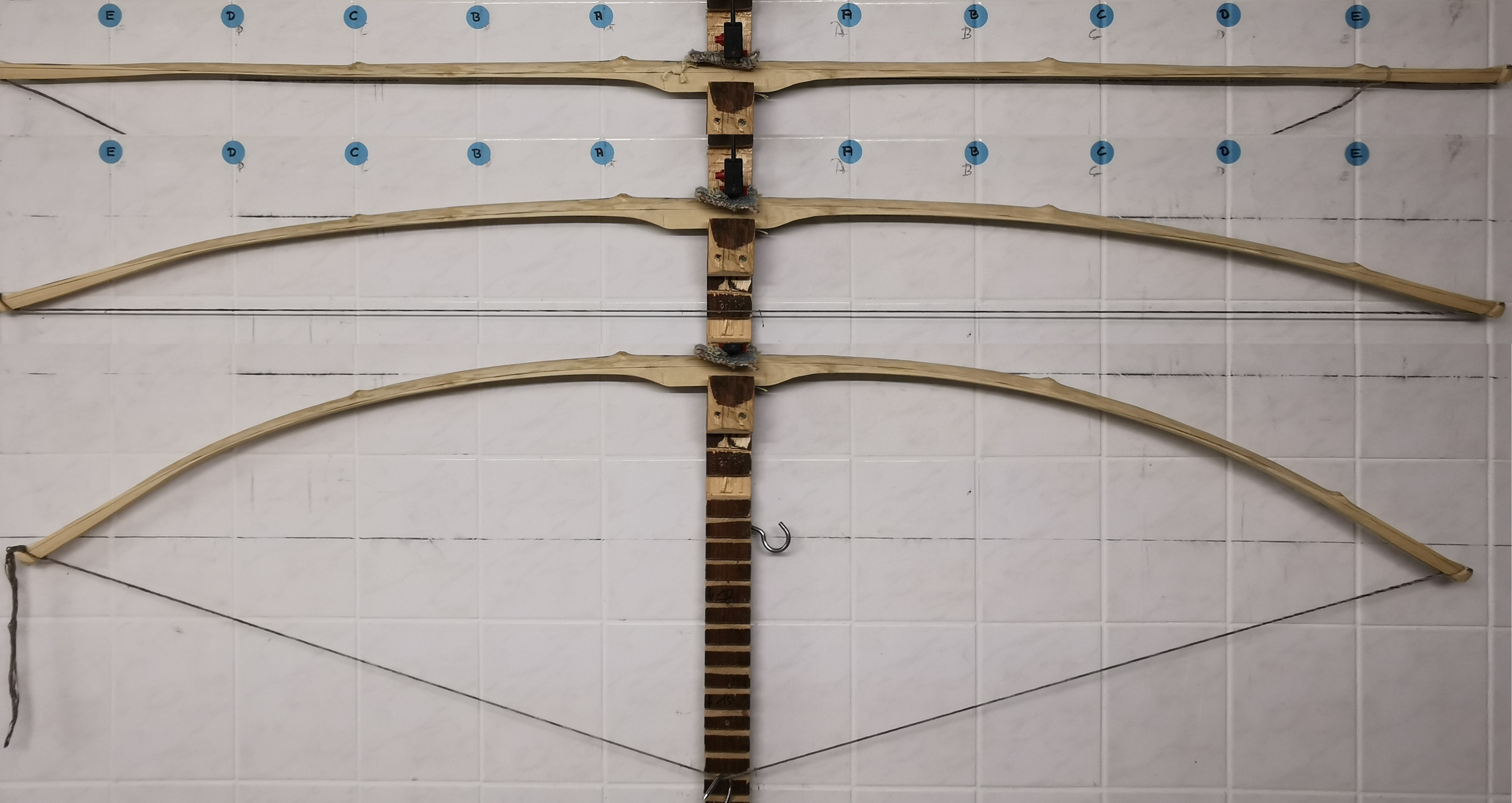 Ich habe den Bogen so aufgehängt, dass die Sehne auf Standhöhe waagerecht ( in Flucht mit der Fliesenfuge ) hängt, und dann beim Auszug darauf geachtet, dass die Tips sich gleichmäßig senken. Wo liegt mein Fehler?
