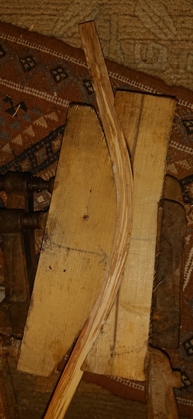 Ich habe heute das Probe Stück mit stehenden Jahresringen auf ein Maß von ca 3 cm Breite und 1,8cm Dicke gehobelt und unter Dampf gebogen...