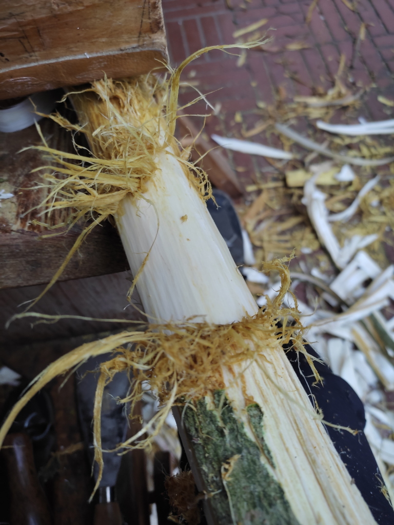 Das ich Hasel und Fichte genommen habe war zum einen in der Nähe, also kurze Strecke und zum anderen gibt es nicht mehr viel Auswahl. Die Eschen haben sie bald alle gefällt oder sie sind umgefallen(besonders die jungen) Ahorn stehe nicht wirklich brauchbare junge Bäume hier herum und Ulmen sind rar geworden . Zum anderen wollte ich nicht schon wieder einen Schwarzdorn oder einen Weißdorn fällen, das wird sonst langweilig. Die heb ich mir lieber für andere Projekte auf