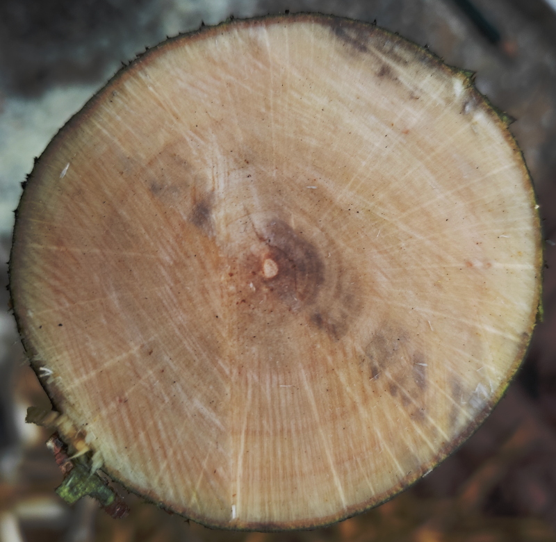 Dann die Walnuß. Im Querschnitt sieht man schöne Jahresringe. Stand unter einem anderen Baum, aber reichte trotz Trockenheit dann doch:
