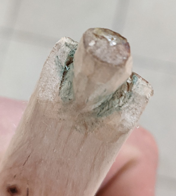 Das einzige was ich machen kann ist Material vom Bauch weg nehmen, was theoretisch auch möglich wäre, da der Bogen eh viel zu stark ist, als das ich ihn effektiv benutzen kann. Ich will aber nicht noch mehr gegrilltes Holz verlieren, an den oberen Wurfarmen ist es jetzt schon nur noch oberflächlich vorhanden.