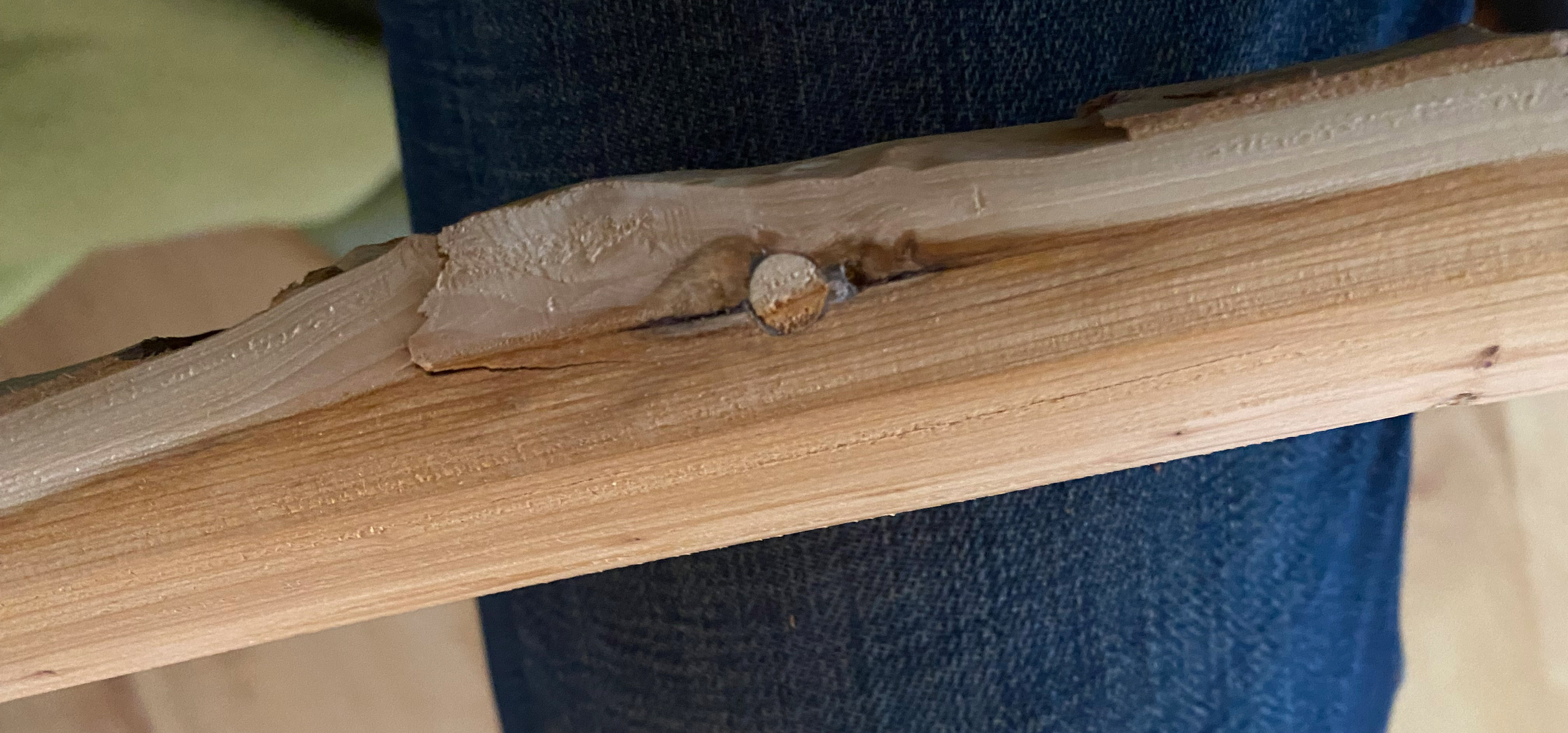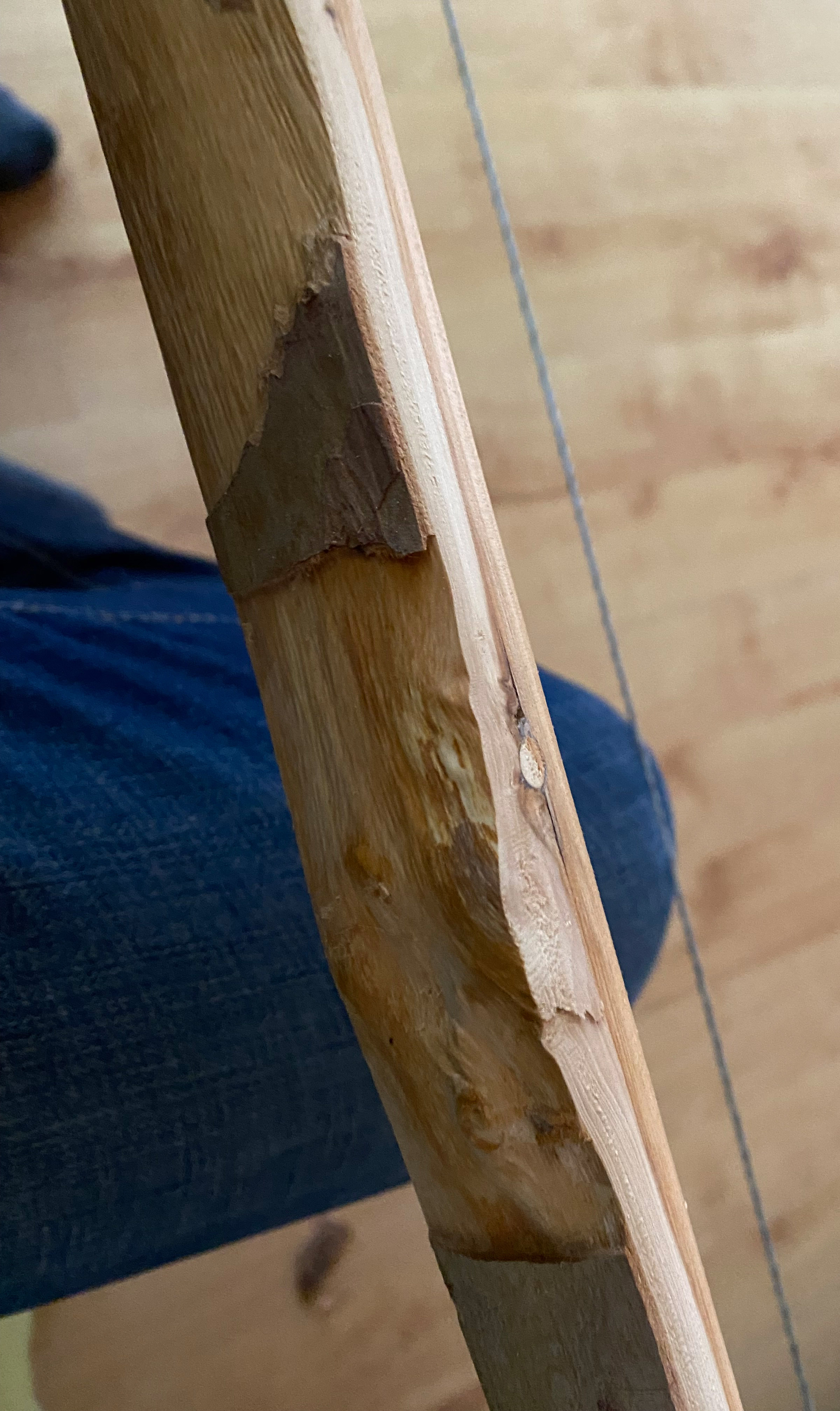 Meine nächste Eibe macht mir Kopfzerbrechen. Nämlich gibt es eine ziemlich dämliche Störung im Holz. Tom hat auf eine verwachsene Verletzung von früher getippt, und das scheint mir schlüssig. Ich habe versucht, mit einem Holzdübel gegenzusteuern und den Bogen heute erstmals auf Standhöhe gebracht.