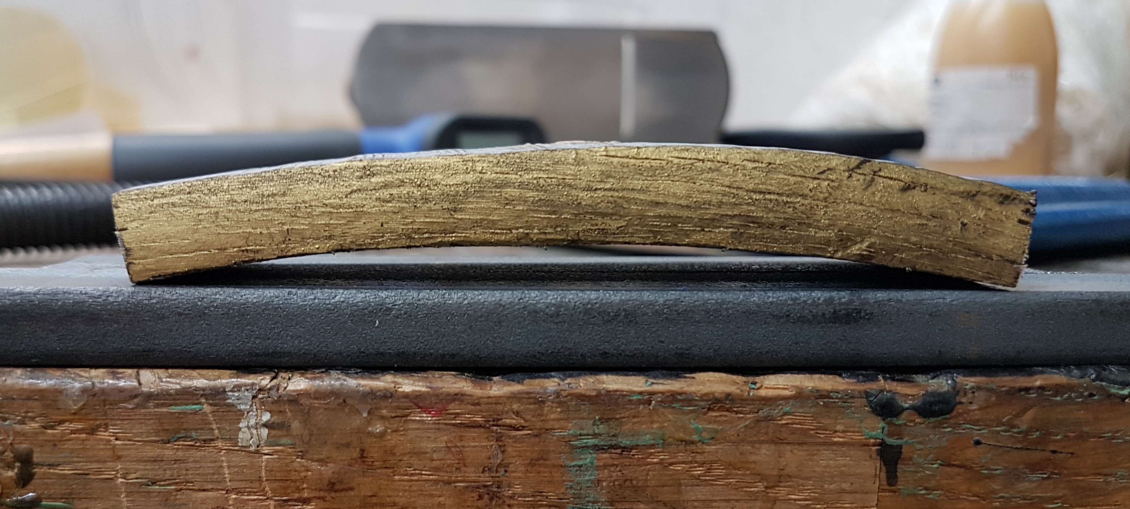 Heute habe ich überschüssigen Kleber vom Rücken entfernt (von der Sehnenlage und neben der Lage) und mehrere Lücken direkt neben dem Sehnenbelag mit trockener Sehne gefüllt. Immerhin 10 g unnötige Masse entfernt. Der Bogen hat aktuell 730 g.