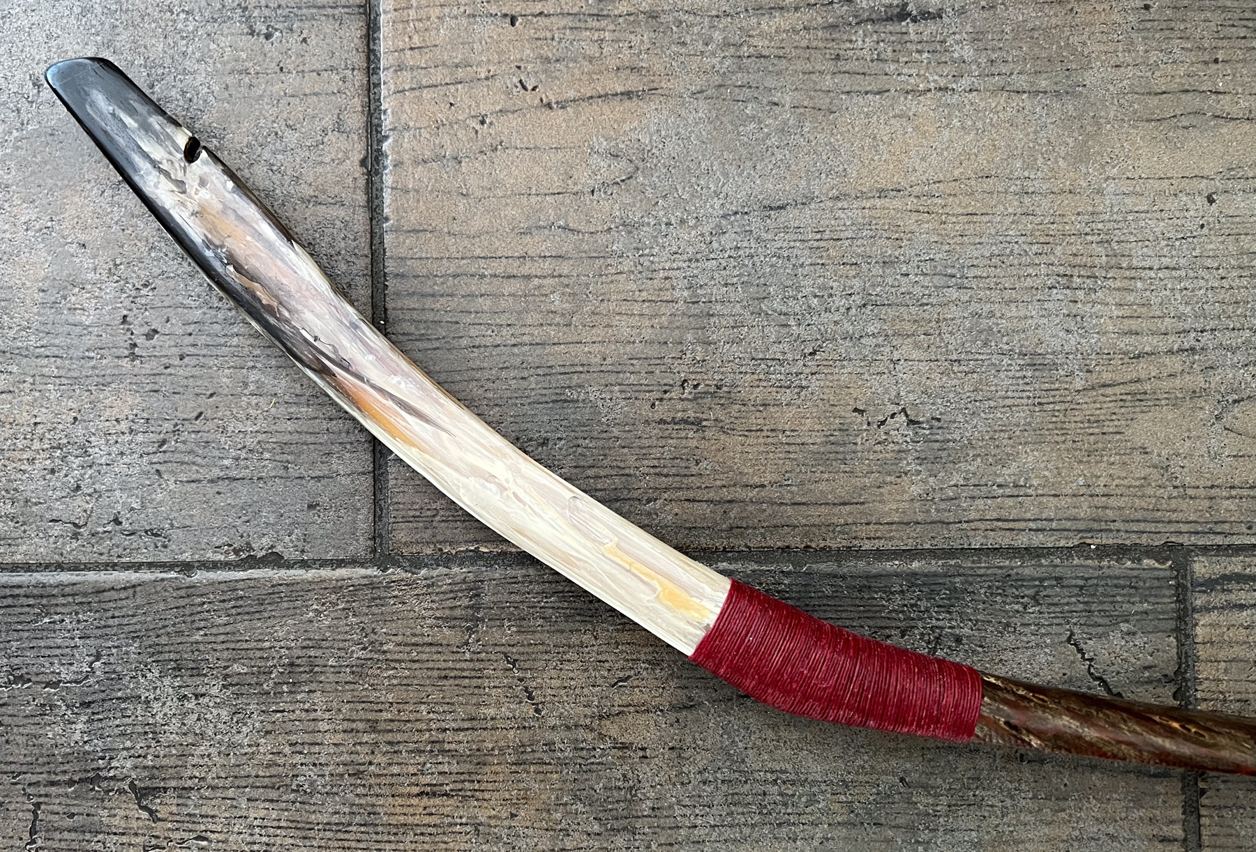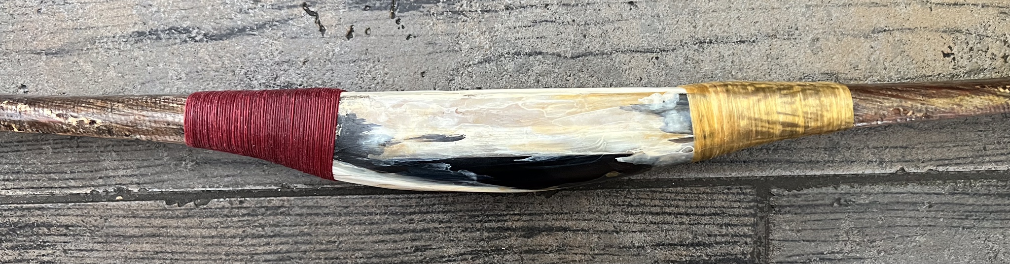 Dann noch den Griff aus hirngegerbtem Hirschleder aufgebracht und mit Leinenwicklungen fixiert, ein bißchen Kontaktkleber ist auch drunter, die Indian style Pfeile auch fertig gewickelt, irgendwie schau ich mir die Wicklungen vom Reiterbogen immer wieder an, bin nicht zu 100 Prozent überzeugt, mir ist es fast zu grell, ich hätte ja noch rostfarbenes Leinen (broken colour) im Angebot, harmoniert irgendwie mit der Kirschrinde besser und wäre nicht so ein extremer Kontrast. Ob ich mal eine Wicklung ersetzen sollte? Ich werde jetz an den Pfeilen weiter machen und alles etwas setzen lassen, die ganze Arbeit nochmal