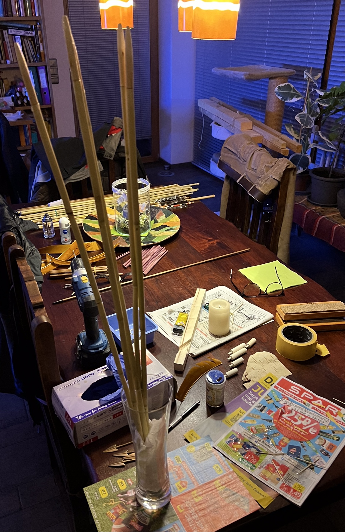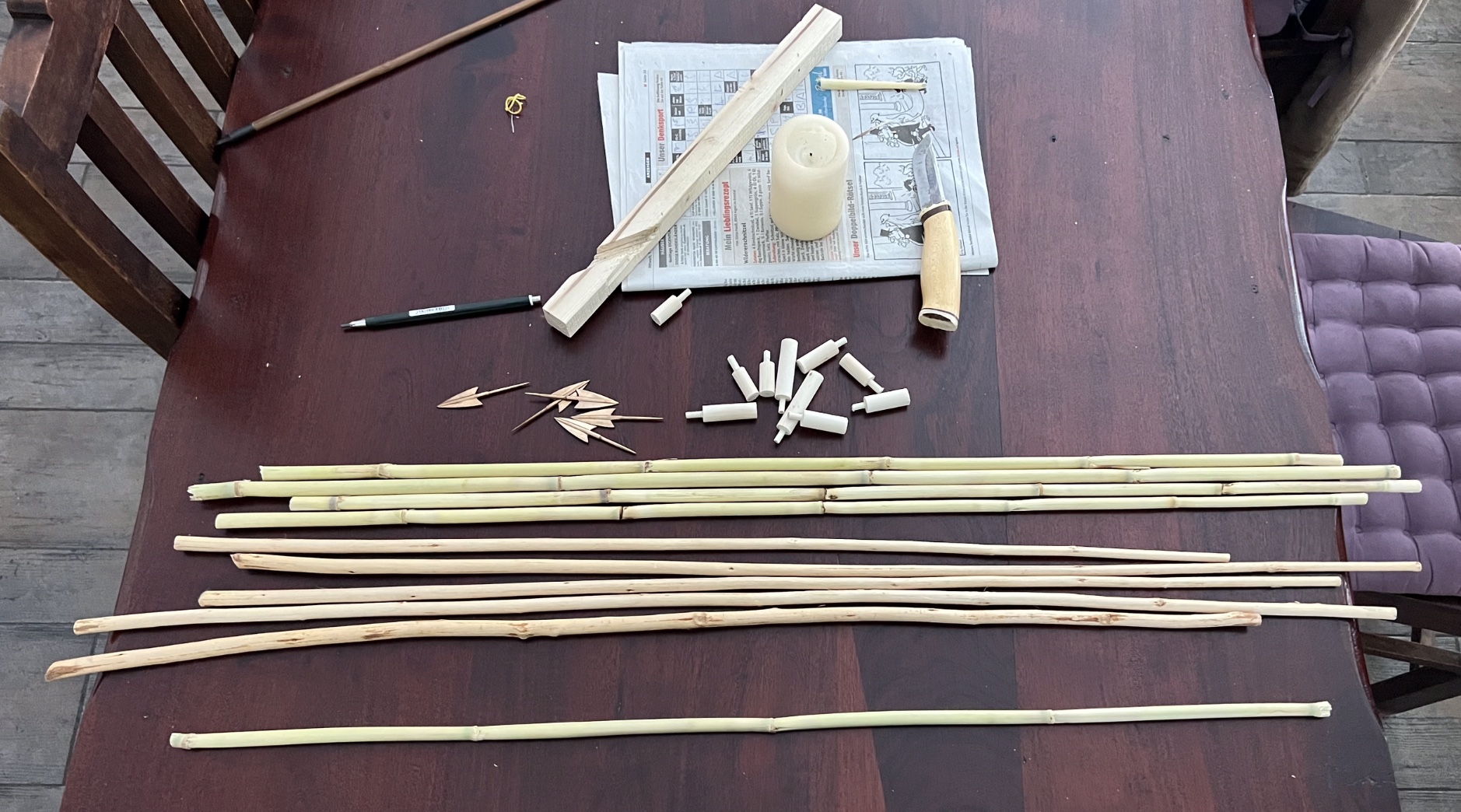 Bei den Pfeilen ist die Wahl jetzt doch auf Arundo donax gefallen, alle Spine 45 Pfund, nicht gerade die Schönsten, richten der Schäfte nach erhitzen mit der Kerzenflamme, die Vorschäfte sind aus Hasel, ebenso die V Nocken, verklebt habe ich mit Epoxy, die Vorschäfte sind im Markkanal bis 3mm aufgebohrt, die Bronzespitzen passen haargenau, anschließend habe ich den Berberitzen Kurzbogen fein getillert und geschliffen bis 600, danach poliert mit Stahlwolle, zuletzt alles mit Tru Oil eingeölt. Die Berberitze ist hart wie Osage, zeigt keinen Set, läßt sich gut polieren, die anderen Berberitzen Halbstämmchen werde ich erst nach dem Sapturnier fertigstellen, ebenso die Flieder, geht sich zeitlich unmöglich aus, der Hasel Kompositbogen verschlingt einfach zu viel Zeit. der ungarische Reiterbogen wird morgen fertig, ich fürchte, dass wird der schönste Bogen, den ich bisher gebaut habe