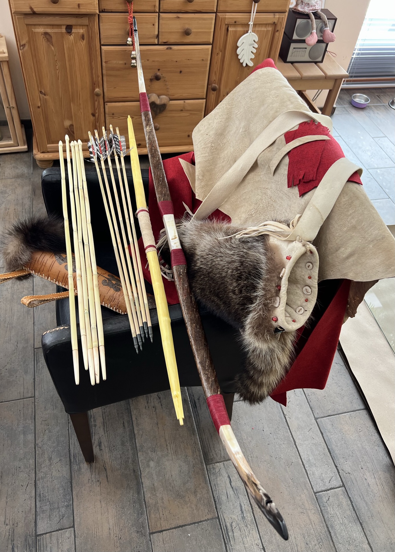 Dann noch den Griff aus hirngegerbtem Hirschleder aufgebracht und mit Leinenwicklungen fixiert, ein bißchen Kontaktkleber ist auch drunter, die Indian style Pfeile auch fertig gewickelt, irgendwie schau ich mir die Wicklungen vom Reiterbogen immer wieder an, bin nicht zu 100 Prozent überzeugt, mir ist es fast zu grell, ich hätte ja noch rostfarbenes Leinen (broken colour) im Angebot, harmoniert irgendwie mit der Kirschrinde besser und wäre nicht so ein extremer Kontrast. Ob ich mal eine Wicklung ersetzen sollte? Ich werde jetz an den Pfeilen weiter machen und alles etwas setzen lassen, die ganze Arbeit nochmal