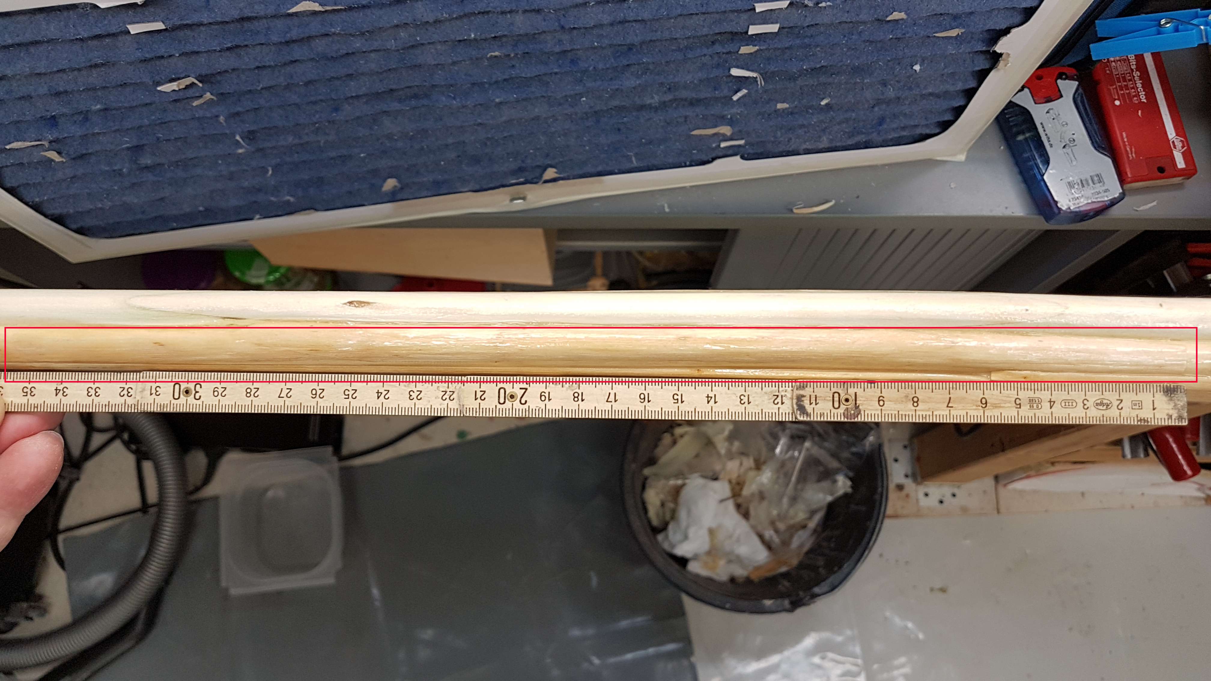 Nur Kleber in die Bruchstellen einzupressen erschien mir sinnlos zu sein, deswegen habe ich restliche Abschnitte der beiden Hölzer gesucht und gefunden. Danach wurde der Bereich mit den beiden Bruchstellen großzügig ausgeschnitten und Passstücke hergestellt. Ein Haselstück habe ich versaut und deswegen den schlechtesten Pfeilschaft geopfert und ein neues Passstück geschnitten (ist auch nicht optimal geworden, mit dem Stück wird es aber versucht). Beim ausschneiden fiel natürlich auch ein Stück einer Kirschpflaumenstange der Säge zum Opfer(das hätte nicht sein müssen, ist aber so wenn man unbedingt die Bandsäge benutzen muss