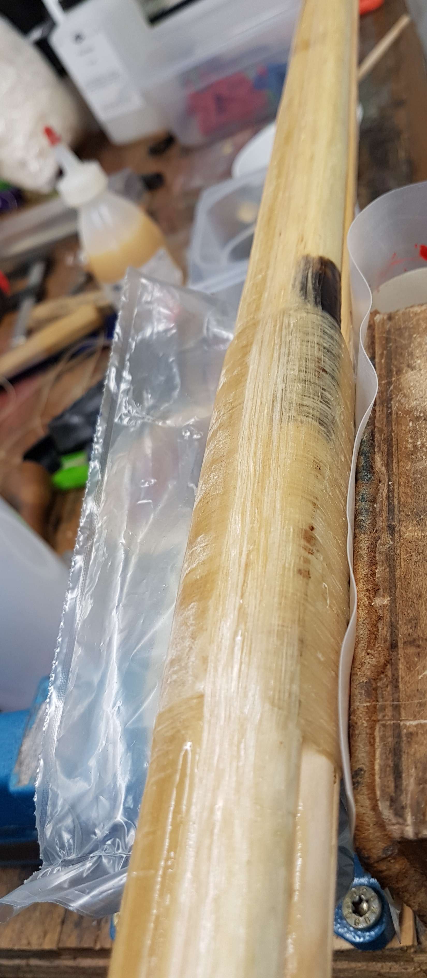 Über das eingepasste Kirschpflaumenstück habe ich eine Lage Hanf geklebt und vorhin die erste Bogenseite über die geflickte Haselstange (jetzt warte ich bis das angetrocknet ist und dann kommt die nächste Seite dran).