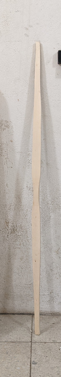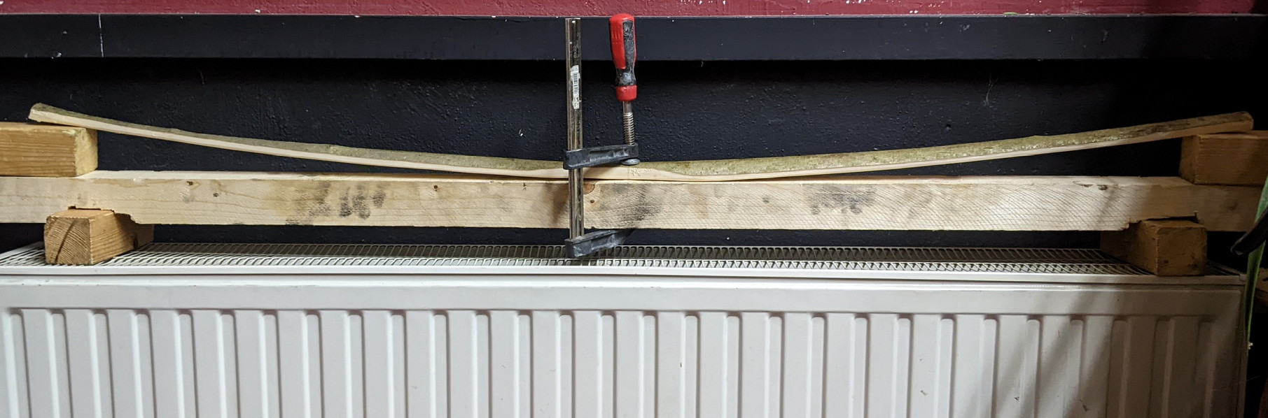 Leider muss ich den Griff wohl zu gründlich geschliffen haben, da er deutlich zu viel über die Mitte biegt... Ich wollte da viel Biegung haben, aber so viel war's Vorgestern nicht (außer ich war zu müde und hab's nicht gesehen). Leider konnte ich durch das ganze rum gebeize den Tiller nicht mehr kontrollieren, da er erst wieder trocknen musste.