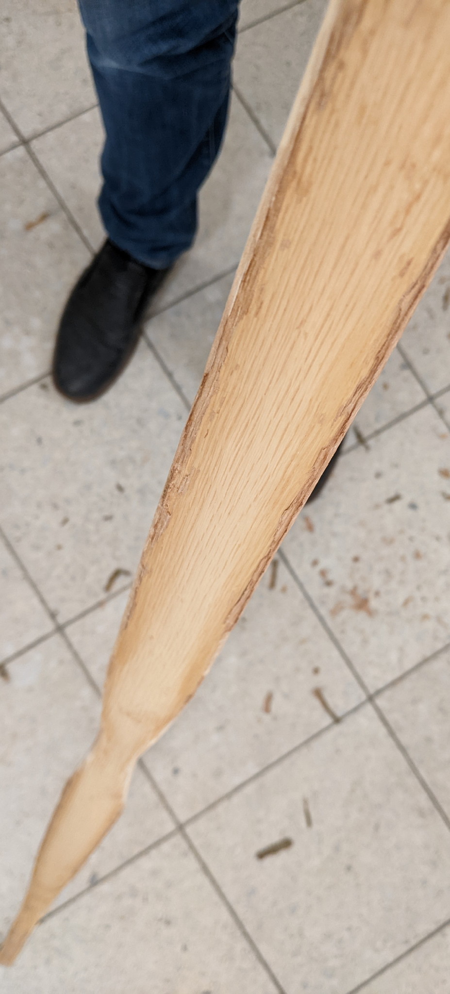 Die Rinde bekomme ich übrigens doch nicht von Versuch drei (was der einzige Grund gewesen wäre, den in die Präsi zu stellen). Die Rinde hat sich nur im Bereich der geflippten Enden gelöst, der Rest sitzt fest auf dem Holz.