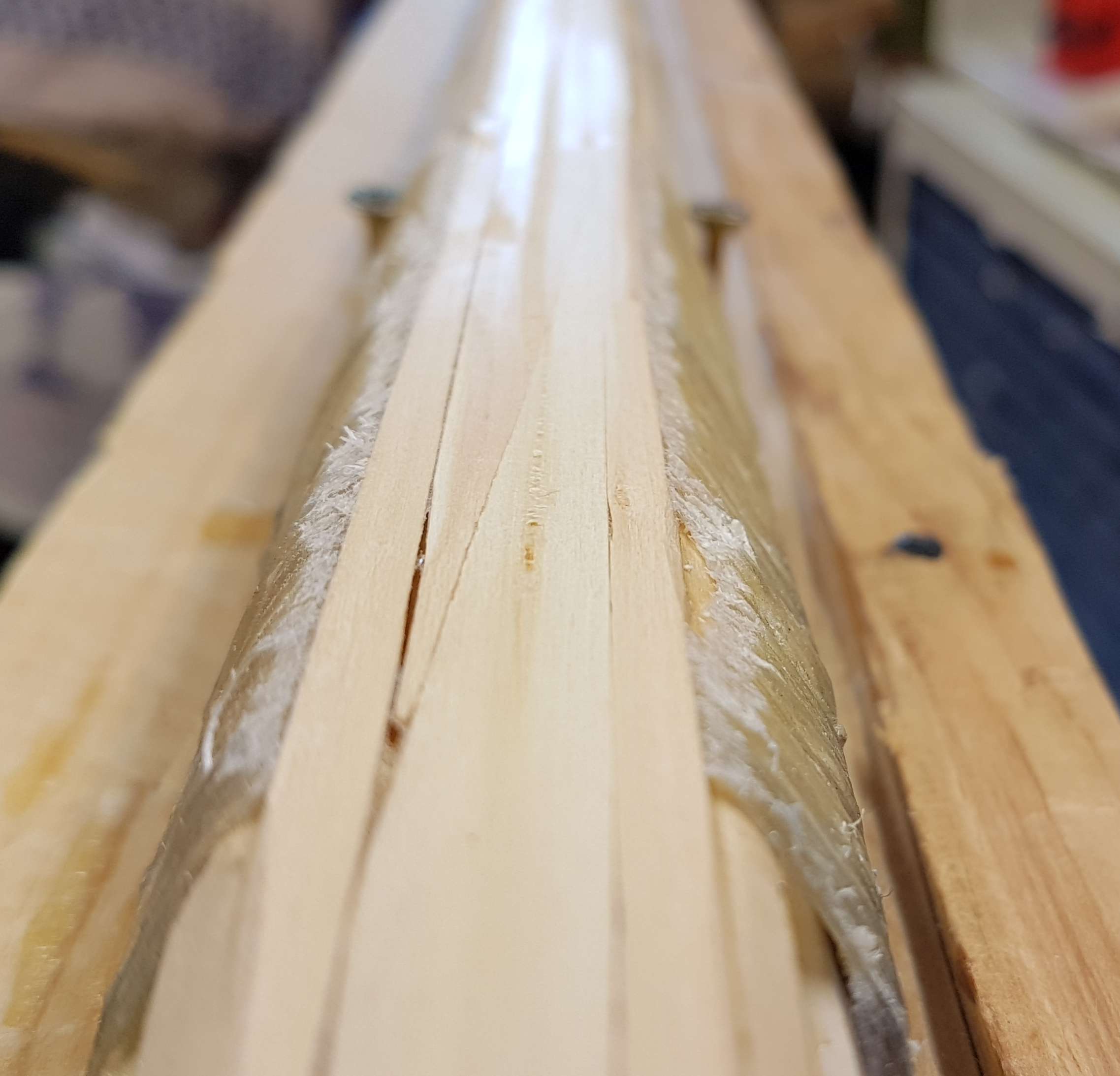 Mal sehen ob das was gibt. Vorhin wurde der Bogen bauchseitig gehobelt, soweit dass ich genug Fläche zum kleben der geteilten Stange habe. Leim drauf und geklebt. Jetzt kurze Pause und später wird das Stängele mit der HLP erhitzt und der Kleber gehärtet. Dann mal sehen ob ich temporäre Sicherungswicklungen anbringe oder einfach mal so einen Biegeversuch unternehme.