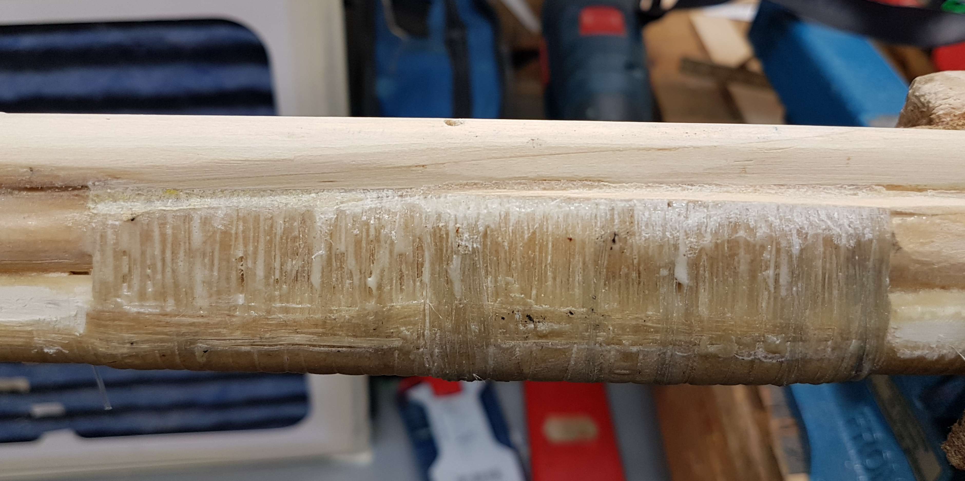 der zusätzlich Flicken, die Wicklung von gestern habe ich wieder entfernt, sonst hätte ich ja den neuen Stab nicht kleben können