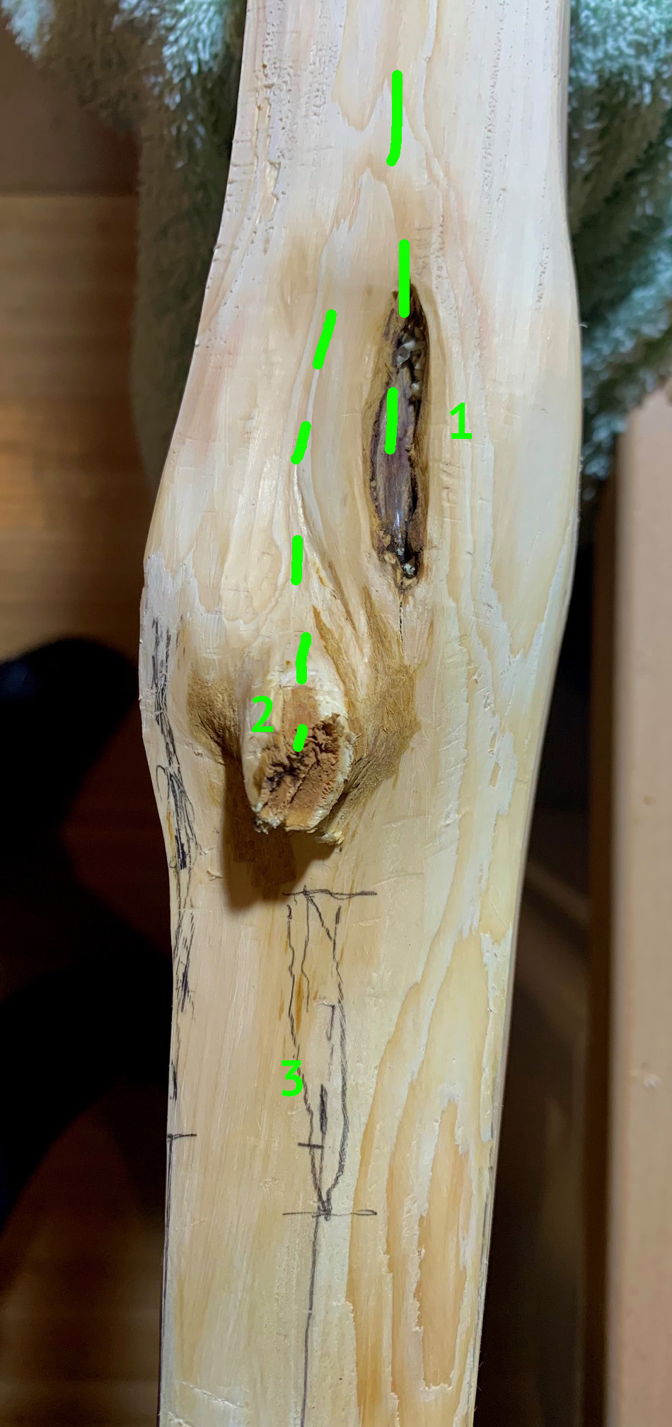 So, heute hab ich mal ein bisschen weitergearbeitet und bin auf dem Bauch des oberen WA (ziemlich genau auf der Hälfte der Länge) auf eine bröselige Stelle gestossen. Das Auge (#1) und der Totast (#2) waren ja schon vorher klar, aber was mache ich mit diesem Spalt (#3)?