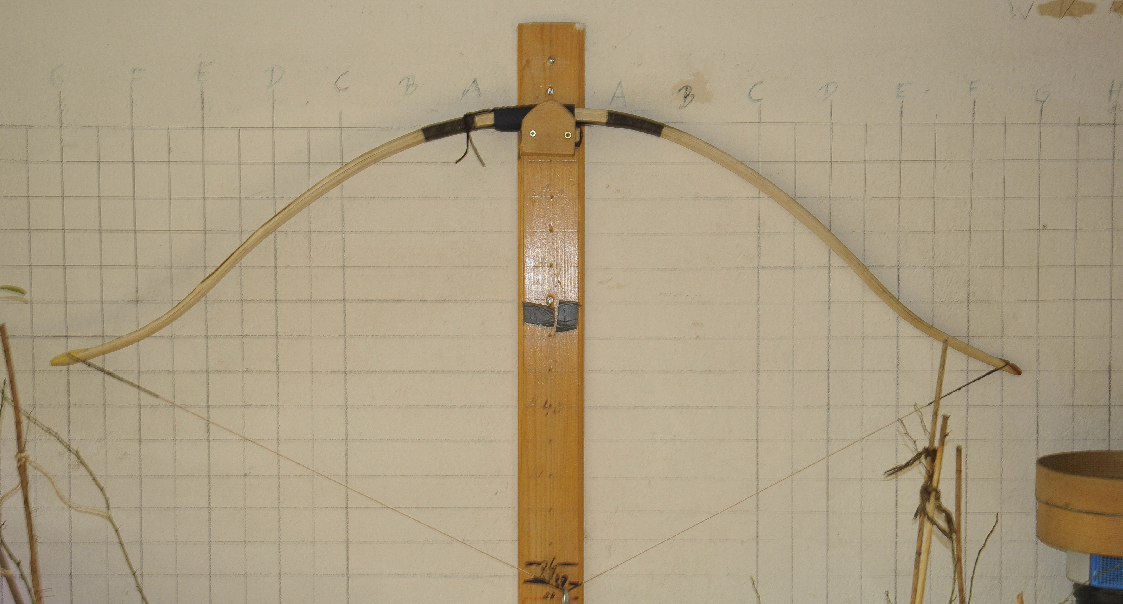 Es gibt eine Sehnenführung (minimal) auf den Recurves und ich hab die Standhöhe erhöht, 17 cm. Die Sehne verläuft nun schön mittig und die WA -Enden sind auch schön breit, das klappt gut.