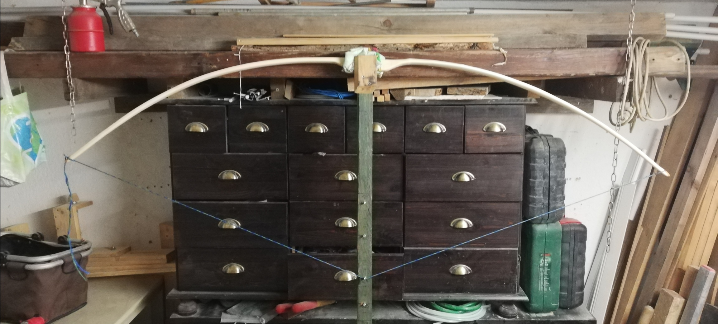 Wurfarm seitlich biegen - die Sehne ist cirka 3-4 cm aus der Mitte und ich würde mit Dampf biegen. frag mich nur gerade wann? erst fertig tillern oder doch jetzt schon?