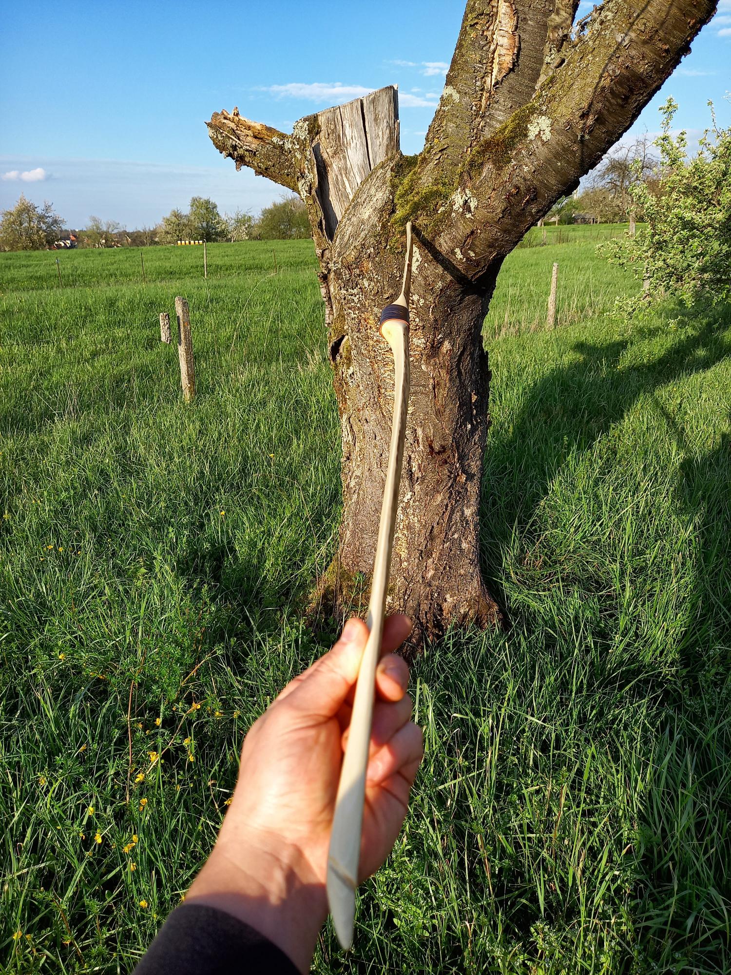 Der Rohling war ein Hasel mit einer ursprünglichen Dicke von 9cm den ich dann gespalten/halbiert und getrocknet habe.