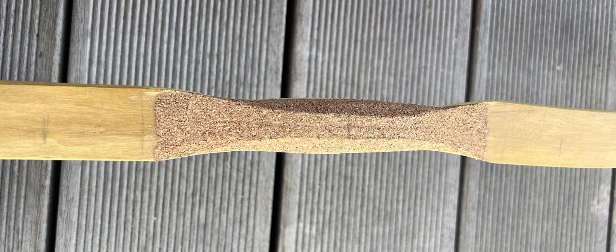 Der Bogen ist natürlich schon fertig aber noch nicht bemalt! Ich habe einen kurzen geraden Osage-Bogen von mir vermessen. Alle 5cm genau abgemessen wieviel jeder Wurfarmschnitt im Vollauszug biegt. Dann vom geplanten Vollauszugsbild alle 5cm den Weg des Wurfarmabschnittes zurückgemessen und das Bild des Bogens im abgespannten Zustand gezeichnet. Dann in mehr als 10 Hitzebehandlungen den Rohling so hingebogen, wie auf der Skizze im errechneten abgespannten Zustand. Aufgrund der Torsion und der geschlängelten Wurfarme war es nicht einfach die Sehne stabil in Wurfarmmitte zu zentrieren. Bis auf die Tips biegen alle Abschnitte gleichmäßig, auch der Griffbereich. Damit nichts abplatzt habe ich den Griff am Rücken mit Korkplatten aufgebaut. Mit mediterranem Griff zieht er bis 28 Zoll problemlos ohne Stacking. Ich denke mit Daumentechnik kann er bis 30 Zoll problemlos gezogen werden. Nach hundert Schuss beträgt das String follow unmittelbar nach dem Abspannen 2cm und nach einer Stunde haben die Straußensehnen alles wieder rausgezogen und es besteht kein Set. Der Nullpunkt liegt bei ca. 50m. Beim Schießen fühlt man kein Verdehen. Der Bogen kann einfach umgedreht werden und er schießt ident. Handschock keiner. Jetzt wird er noch bemalt und dann kommt er in die Präsentation
