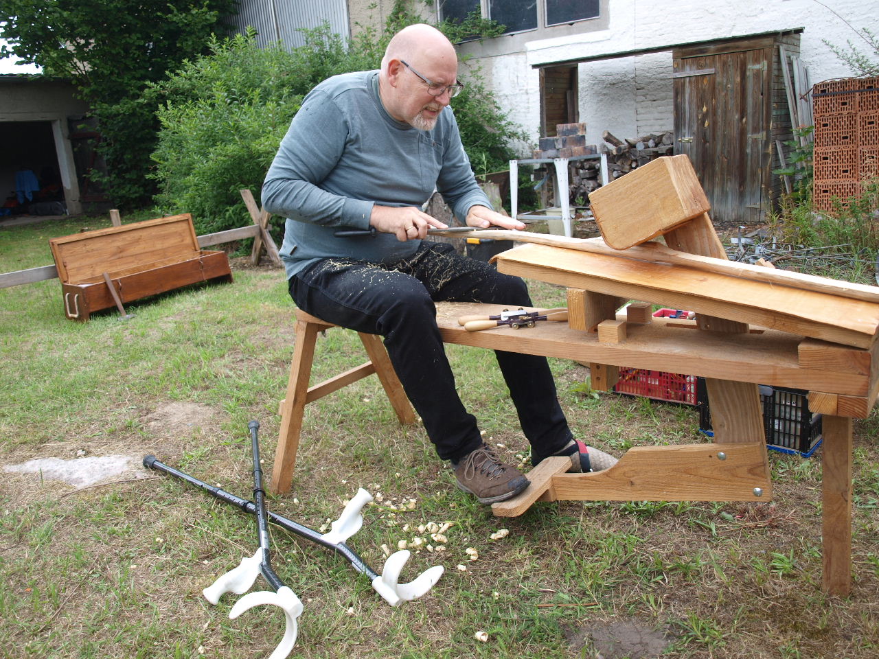 Danach wurde an verschiedenen Bögen aus Hasel, Manau, Esche, Hickory, Eberesche, Robinie, Perückenstrauch und anderen Hölzern geschnitzt.