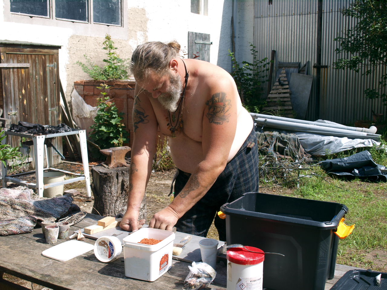 Eddy wollte mit dem Bronzeguss beginnen, aber leider hatte sich der Lüfter der Feldesse verabschiedet. Mit den Schamottsteinen und einer HLP wurde am Boden ein Provisorium gebaut, welches die hohen Temperaturen einer Bronzeschmelze erzeugen sollte. Tatsächlich klappte es nach einigen Problemen mit der leicht angeschmolzenen HLP.