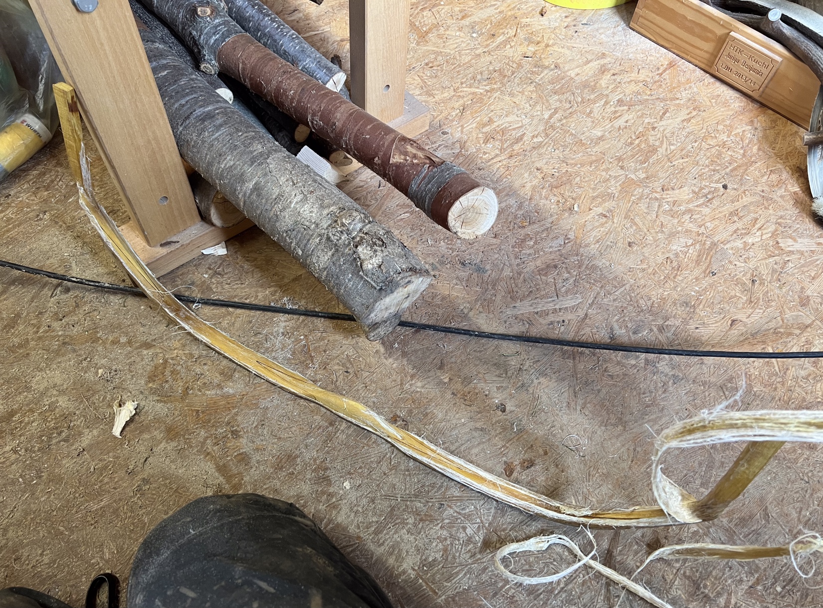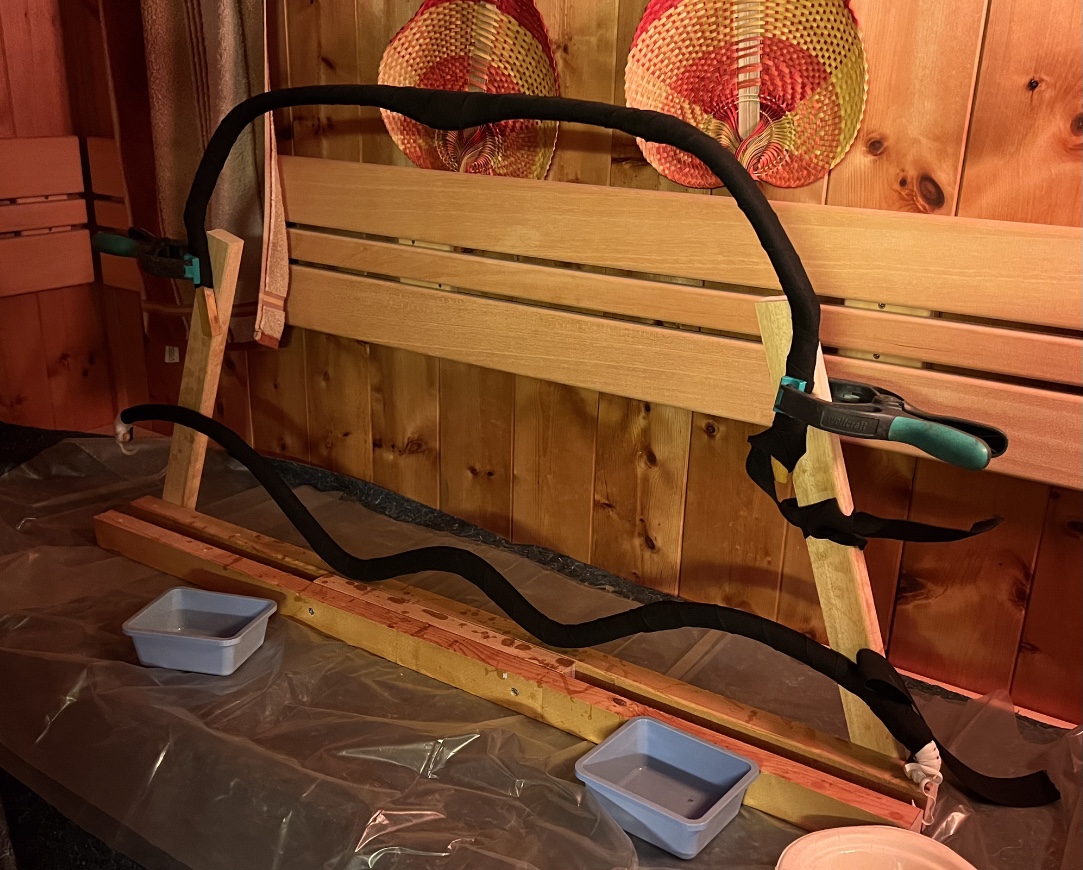 Also wieder von vorne: habe alles mit der groben Feile aufgeraut, entfettet mit Aceton, heißes Wasser drauf gestrichen damit sich die Fasern aufstellen, trocknen lassen, Einstreichen mit Hautleim, Einföhnen und mit frisch gezupften Straußensehnen belegt. Hautleim habe ich noch eine angefangene Packung gefunden, scheint viel besser zu kleben! Habe gleich mein zweites Projekt mit belegt. Alles schön mit Gummi gewickelt und ab in Sauna bei 55 Grad für eine Stunde, der überschüssige Kleber tropft durch die Gummiporen. Jetzt gelieren lassen und nach 2 Stunden dann auswickeln und hoffen……