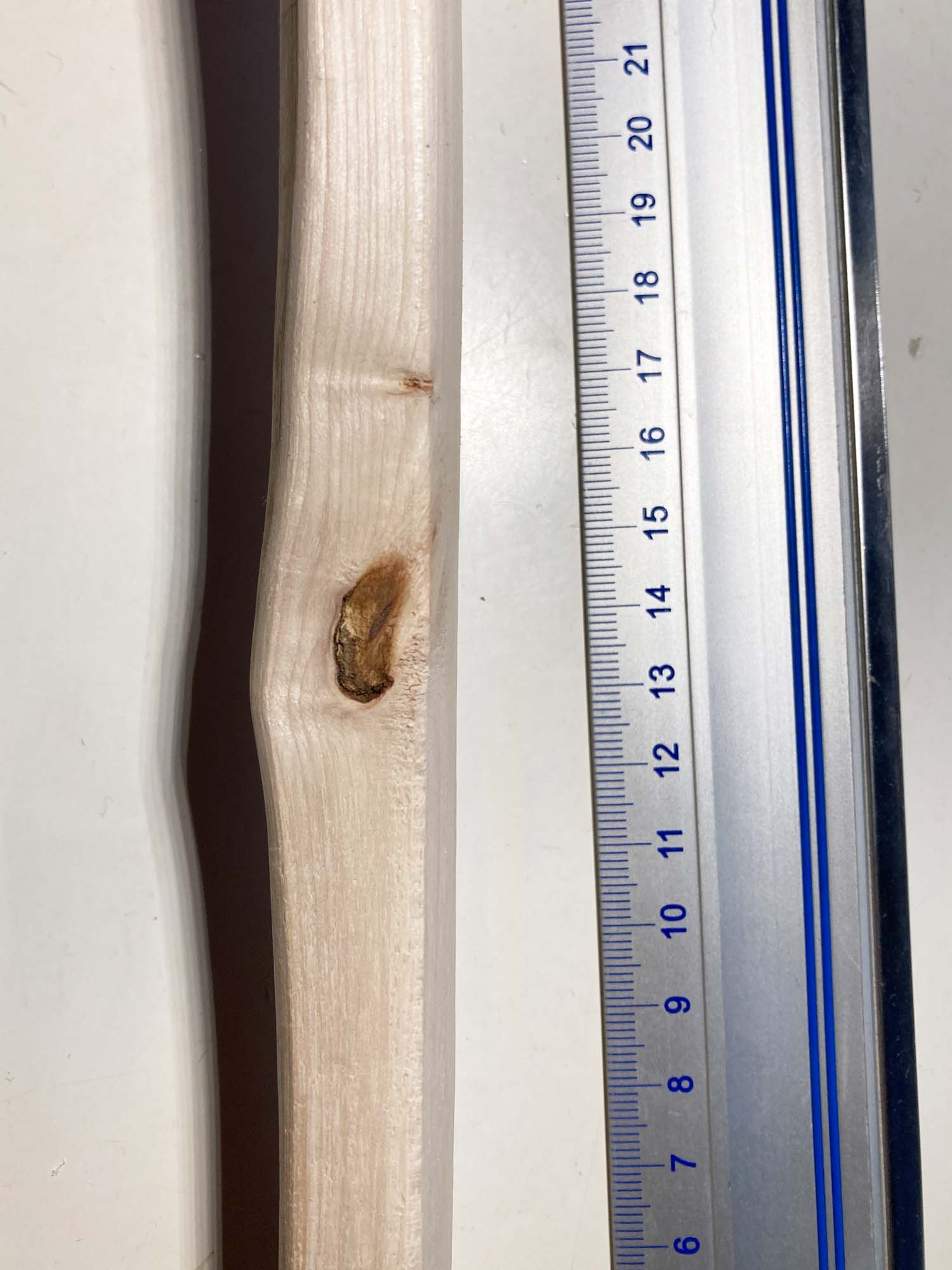 Bisher habe ich nur noch 2 bis 3 Millimeter am Bauch abgetragen, der Stave biegt sich jetzt leicht, ist aber noch jenseits von Gut und Böse, da muss also noch einiges runter. Dabei habe ich meiner Meinung nach auch den Ursprung des toten Astes freigelegt, der garnicht tot und bröselig aussieht, also vielleicht fällt das meiste beim Bodentiller weg und das Problem hat sich erübrigt. Das ist jedenfalls meine Hoffnung, feine Späne und Staub habe ich trotzdem schon gesammelt.
