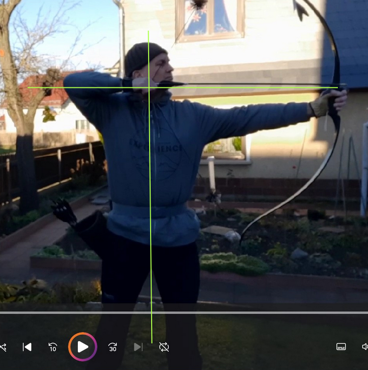 wenn man die senkrechte Linie und die Linie einzeichnet, in der sich die Kraft im System entwickelt, ergibt sich bei dir das beigefügte Bild. Die waagerechte Linie liegt etwas unter dem Pfeil, weil sich der Druckpunkt im Bogen und auch der Zugpunkt mit dem Daumen unterhalb des Pfeiles befinden. Wenn man den leicht tiefer drückenden linken Daumen, den rechten Daumen und den rechten Ellenbogen miteinander verbindet, ergibt sich nahezu eine Gerade! Das sieht schon gut aus!