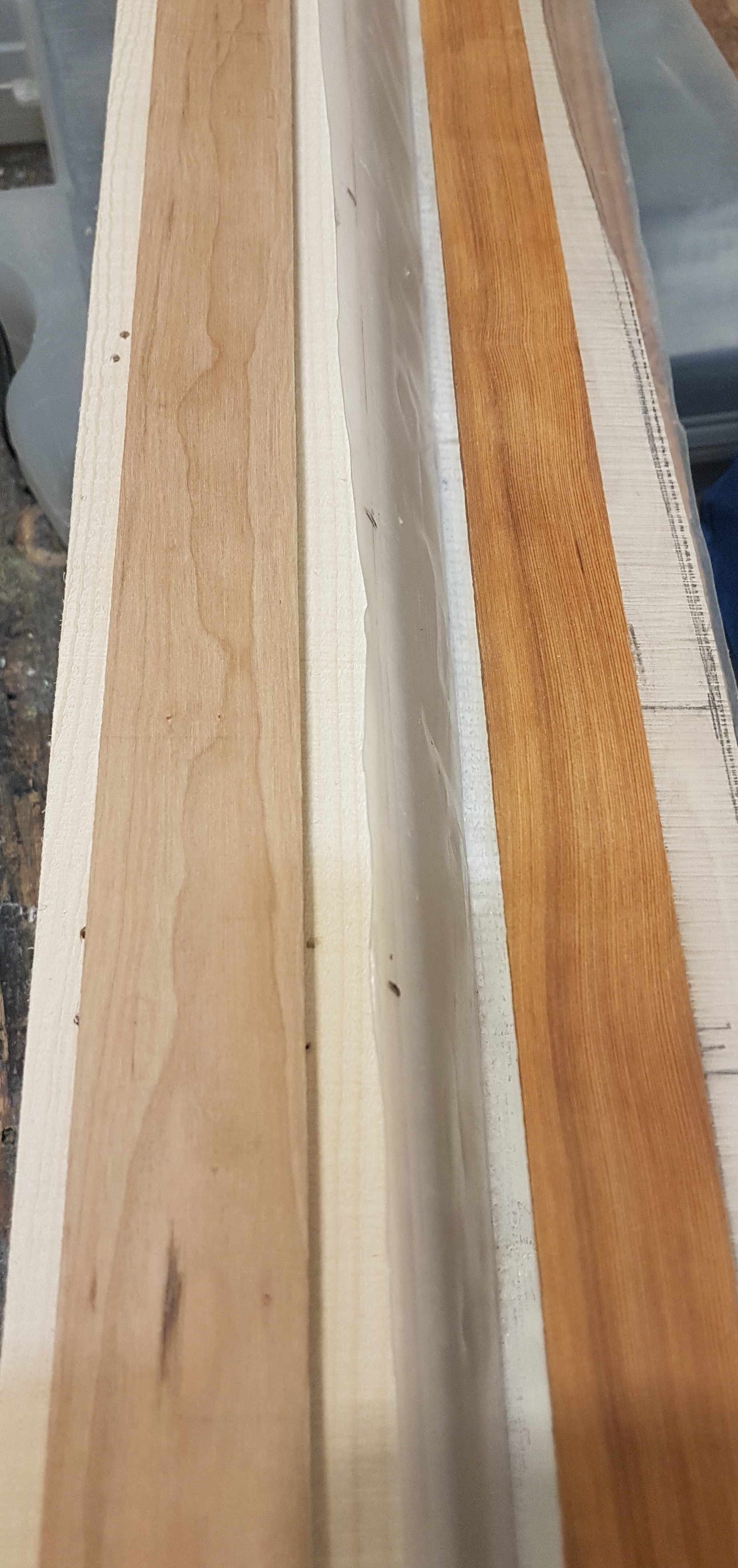 Für die Holzlaminate benutze ich zum einen meine Bandsäge, damit kann ich sehr präzise sägen. Zum anderen den Bandschleifer. Das dauert leider entsprechend lange (nur bei der Mittellage) trotz gutem Mirka Schleifgewebe. Das Bauchlaminat wird nicht getapert, sondern nur gesägt und plan geschliffen. Die übrige Bearbeitung dann mit Raspeln, Feile, Schleifpapier und Ziehklingen.