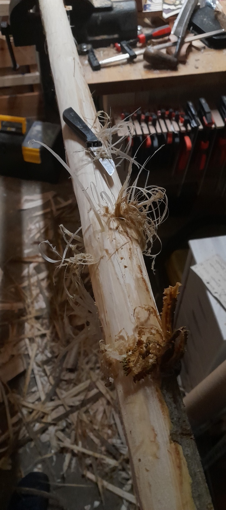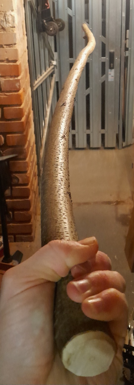 Mein Favorit war leider schon tot, deshalb wurde's ein anderer, der nochmal dünner war, 3,5cm am dicken Ende. Mal gucken ob draus ein Bogen wird, und wenn doch, ob der die 30# schafft. Was tut man nicht alles für die Wissenschaft.