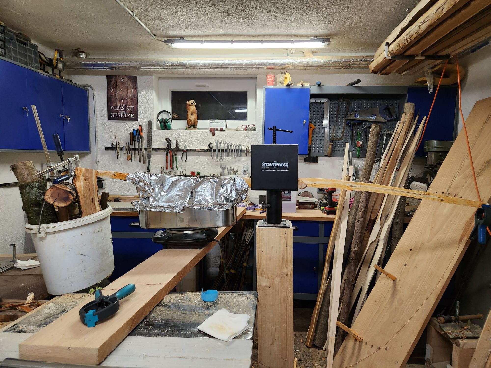 Deshalb hab ich mir überlegt ihn im eingespannten Zustand zu dämpfen. Ich weiß das sieht sehr rustikal aus, aber ich sah keine andere Lösung. Zuerst hatte ich den Schießwürfel ans Ende vom Bogen gehengt, in Erwartung dass sich die Sehnenlage dann von allein korrigieren wird. Da das aber zu wenig Gewicht war hab ich dann einen Kübel dran gehengt und einige Metallteile und Holz eingeschlichtet. Dann hab ich noch händisch versucht den deflex zu entfernen. Mal schaun was da morgen raus kommt.