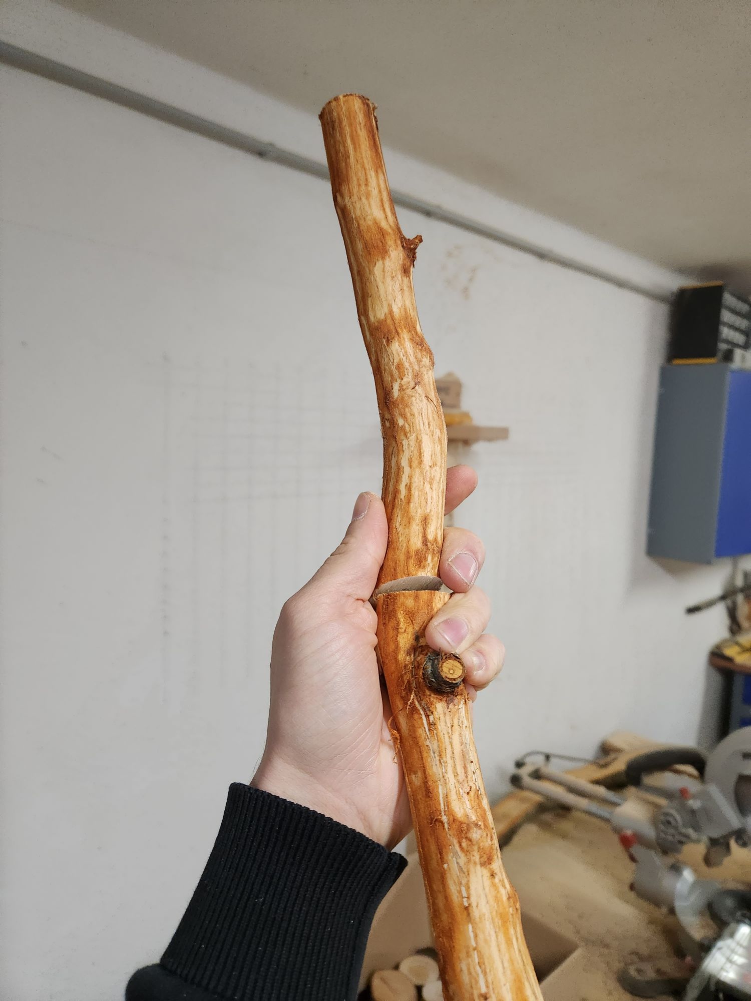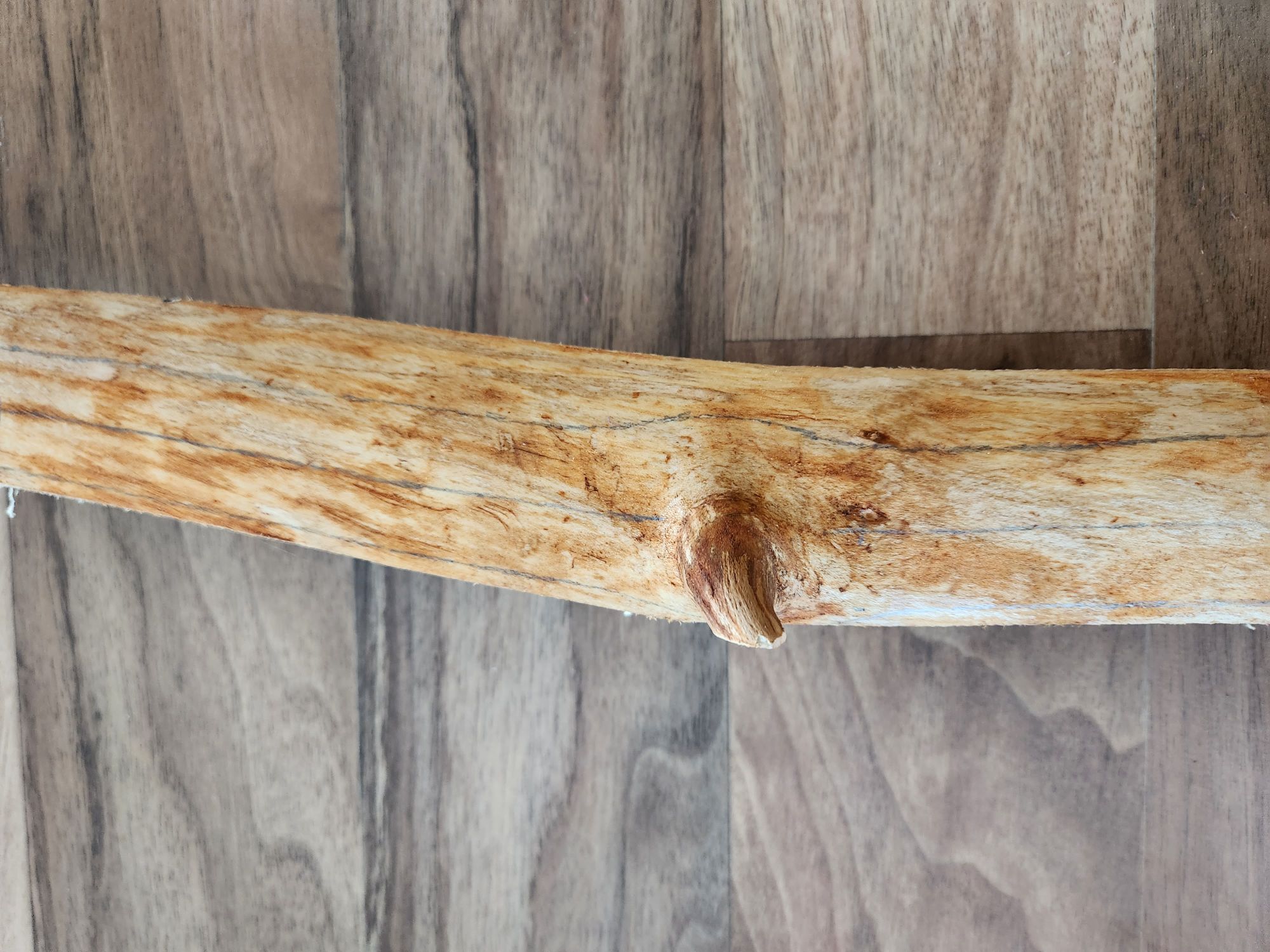 Heute hab ich mal bei Rohling 2 weiter gemacht (der mit dem starken Deflex). Er lag bis jetzt noch eingespannt draußen. Dem hab ich nun das reflexe Stück am Ende entfernt sodass nun an beiden Enden ein Ast sitzt. Diese möchte ich zum Sehne einhengen verwenden.