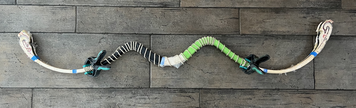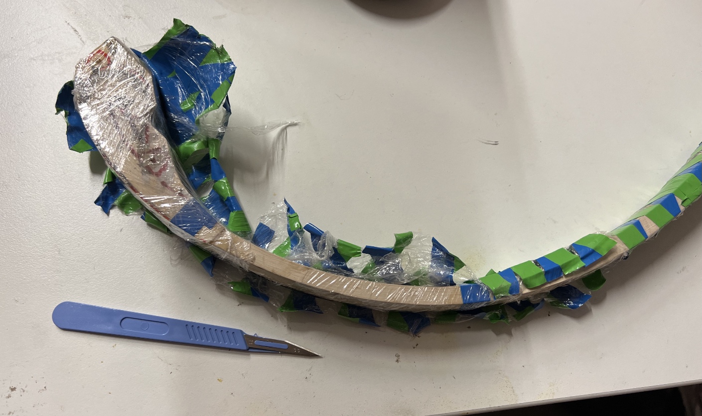 Auspacken geht einfach, mit dem Skalpell aufschneiden und ausschälen. Dann das Horn für die deflexen Bogenknie ausgeschnitten und auf 4mm geschliffen. Im Backrohr bei 140 Grad für 30 Minuten erhitzt. Dann an den Bogenbauch gewickelt. Dabei ist die Platte im engeren Knie gebrochen. Neue Platte ausschneiden und auf 4mm schleifen. Wieder Backrohr, dann aber über ein Glas gebogen und dann erst an den Bogenbauch gewickelt. Diesmal hat es geklappt. Abkühlen lassen und mit Epoxy aufgeklebt. Streifen mit Isolierbandstreifen punktuell fixiert. Paketbandfolie und darüber Isolierbandwicklung, zusätzlich Schnurwicklung. Jetzt wieder über Nacht aushärten lassen.