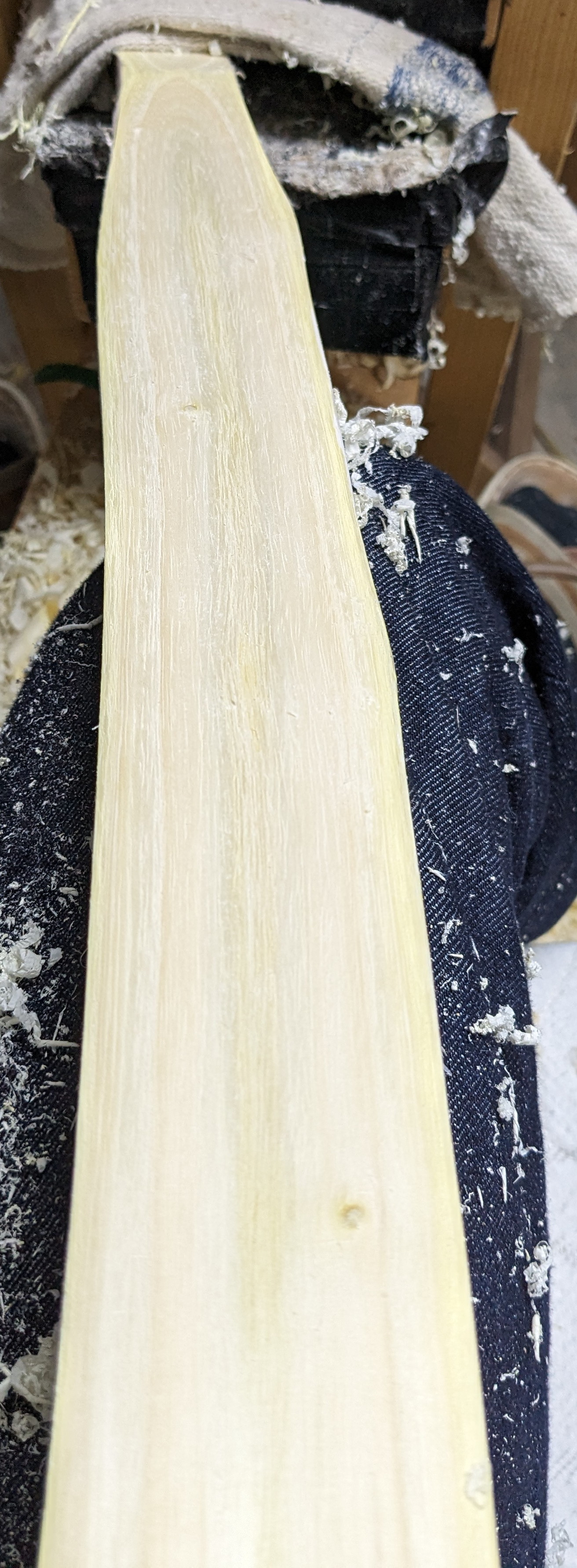 Weiter ging's bei der Robinie. Decrowning zum ersten Kern Ring, vom Bauch etwas Holz abgetragen und das seitliche Profil grob ausgearbeitet. Zum Schluss rückwärts auf einen Balken gezwängt. Da er sich nicht gut gebogen hat, habe ich nochmal ein bisschen Holz abgetragen, das er sich mehr in den äußeren Wurfarmen Reflex biegt und der deflex etwas raus gebogen wird.